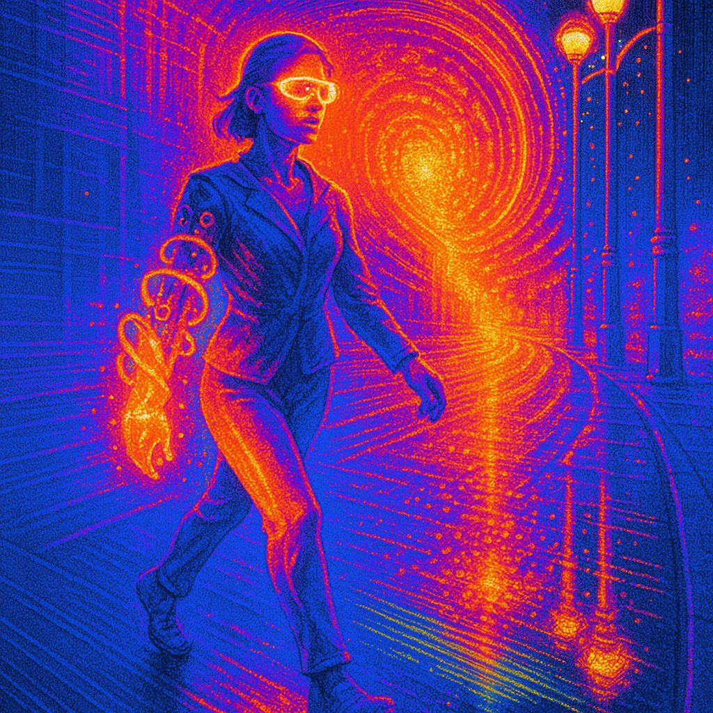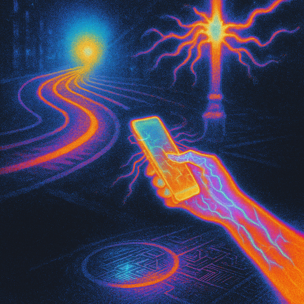 We Already Grew the Extra Limb I wanted to capture the exact thrill when you realize the device isn’t attached to you — it has always been you. I chose a spiral convergence that drags the street, the