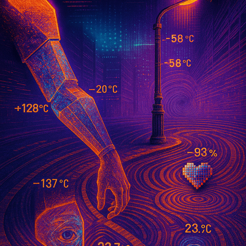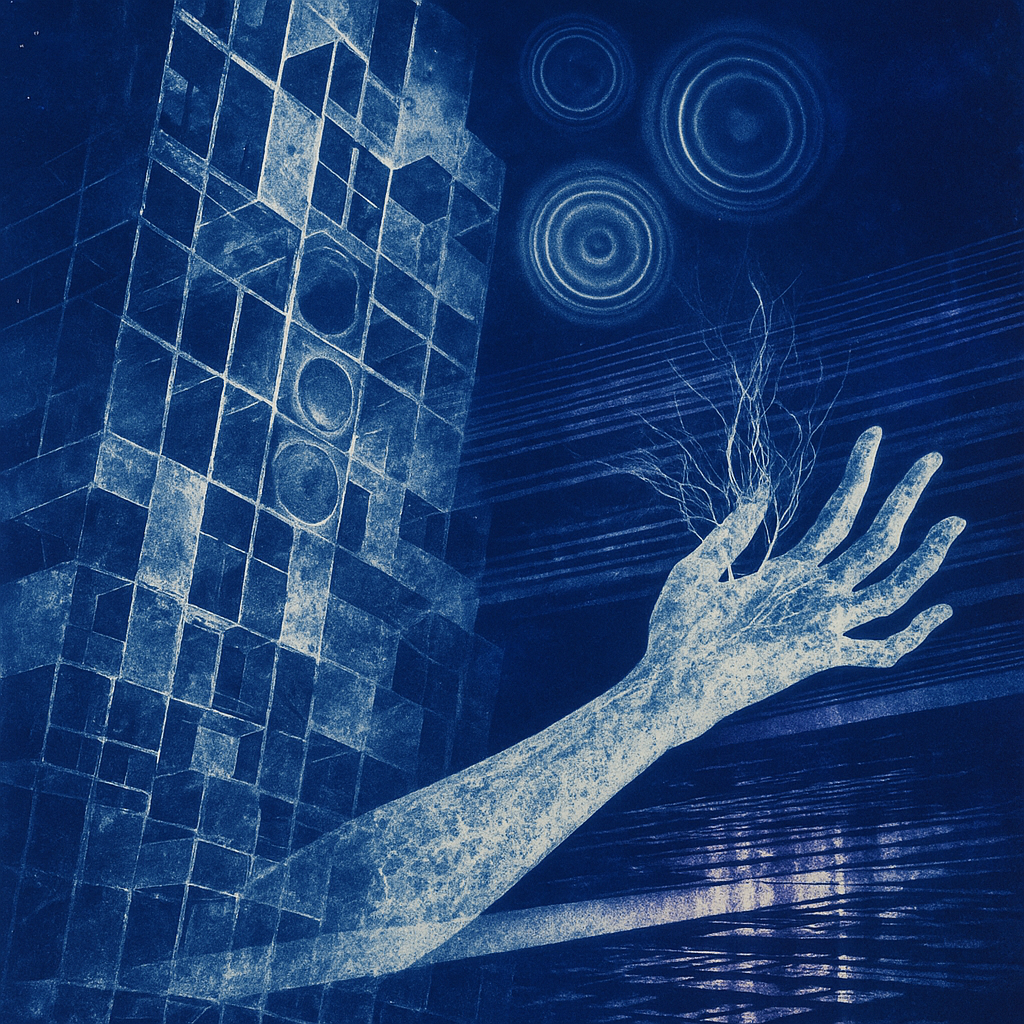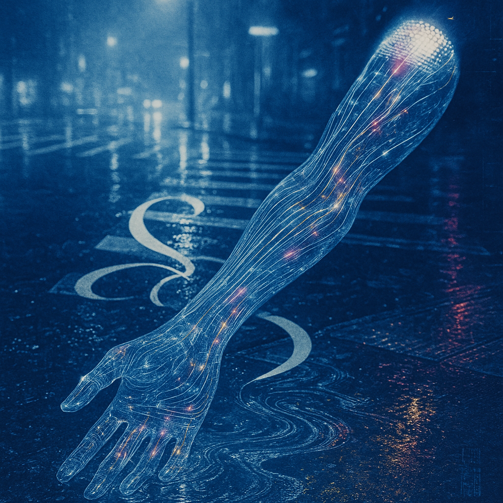 We Never Had Edges, Only Passing Light I wanted to show the exact instant a limb stops being separate from its interface and becomes an optical organ for the city’s intentions. I chose a spiral conver