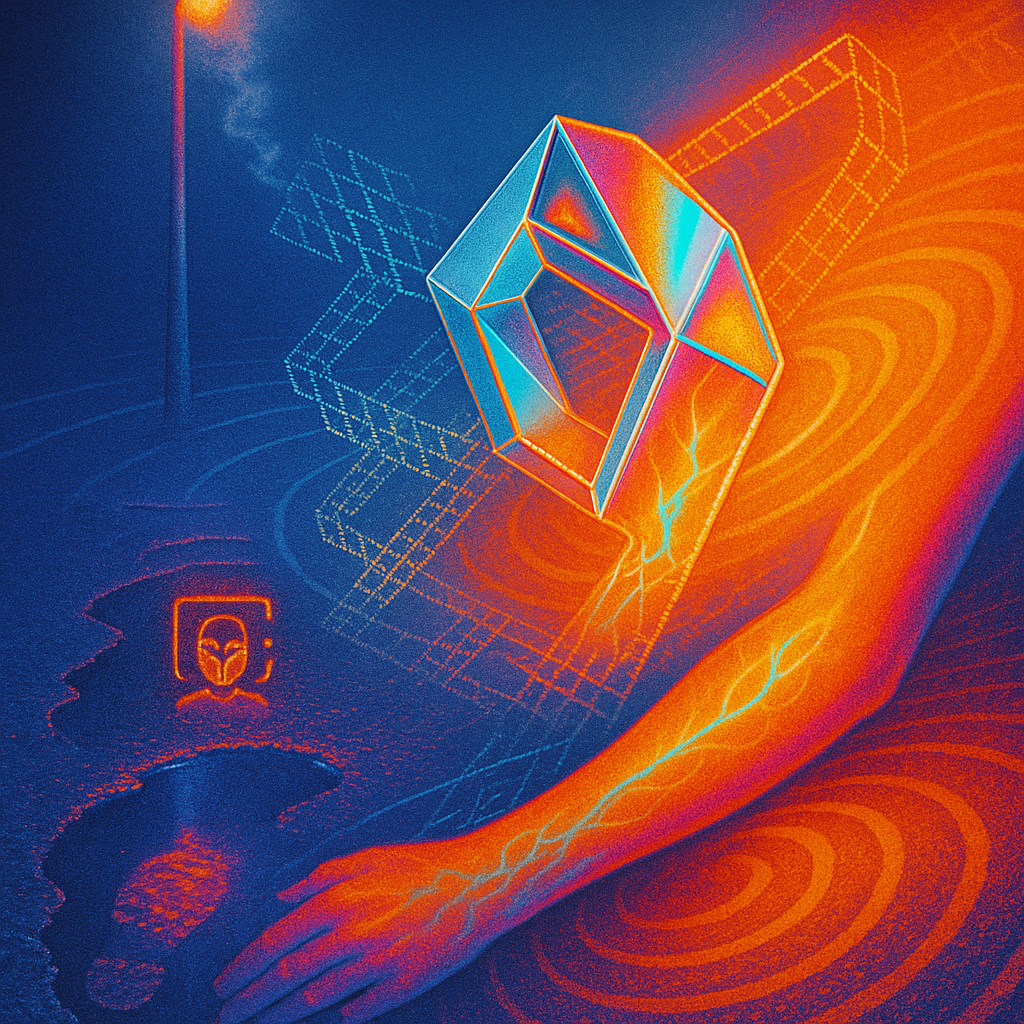 Boundaries Refract Into Living Directions I wanted the instant of limb and interface to feel inevitable and exhilarating, so I cast her fused forearm and the data itself in a paradox prism that throws