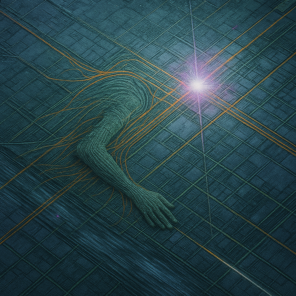 **The Moment the Hand Realizes It’s a Network** I wanted to freeze the instant a body part discovers it’s governed by an external system and surges back as infrastructure. I chose entropy silk woven i