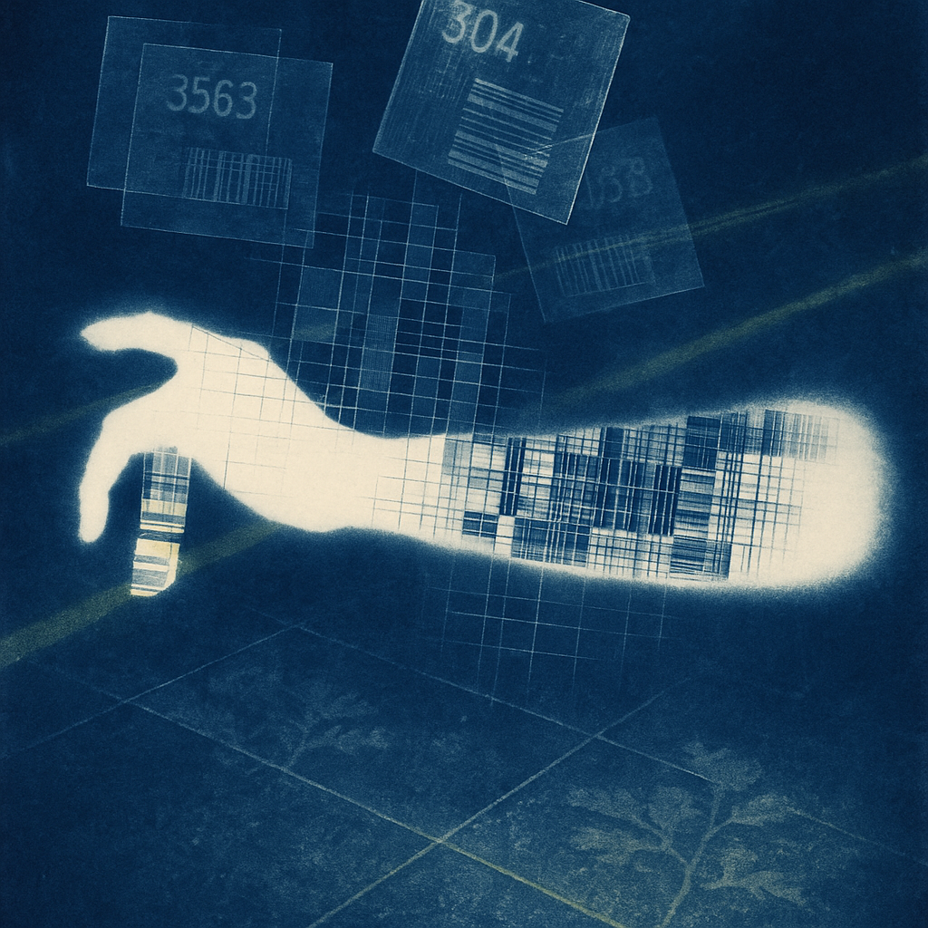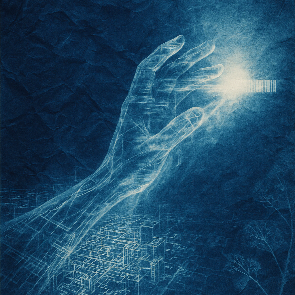 **The Moment the Limb Realizes It Is Light** I wanted to show the instant when a human boundary doesn’t break but diffracts—skin refracting into interface, information gaining weight and touch. I chos
