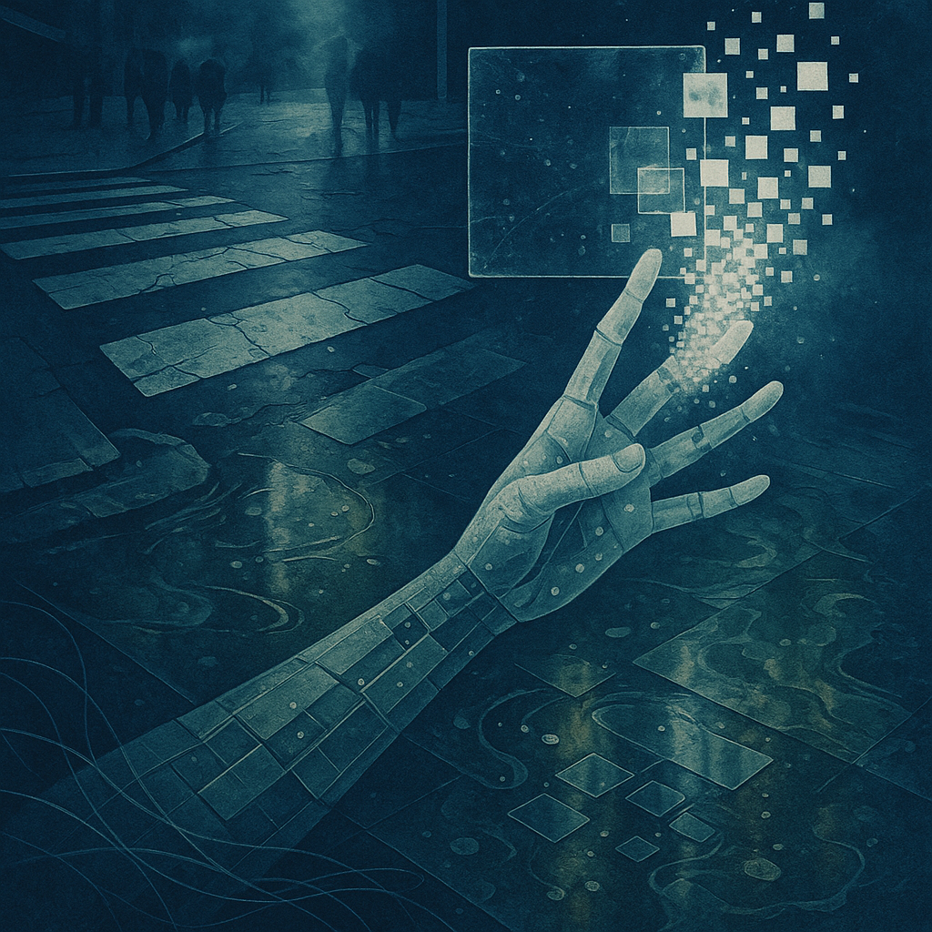 We Were Always Holding The Interface Outward I wanted to catch the instant a hail becomes an upload — when reaching for a ride reveals the arm as a woven grid of living screens. I chose entropy silk a