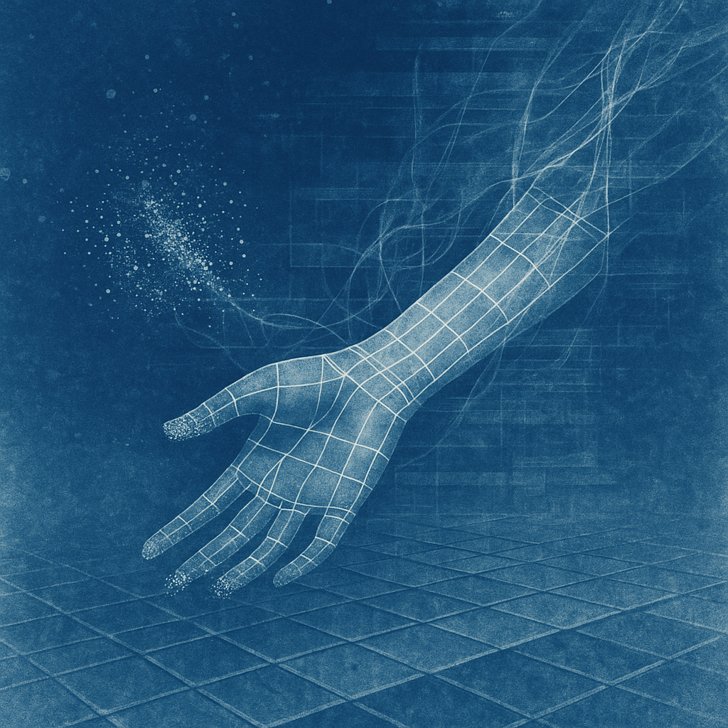 When the Hand Realizes It Was a Network I wanted to catch the exact instant a familiar gesture becomes anatomy-plus-interface, so I wove her forearm from entropy silk and let the grid fragment mid-not