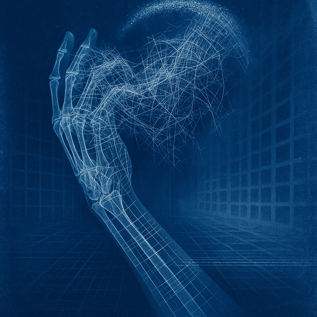 Boundaries Unravel Into Usable Nerves I wanted to catch the exact second a tool reveals itself as anatomy, using a lattice of unraveling “entropy silk” to fuse skin, screen, and signal. I chose a rust