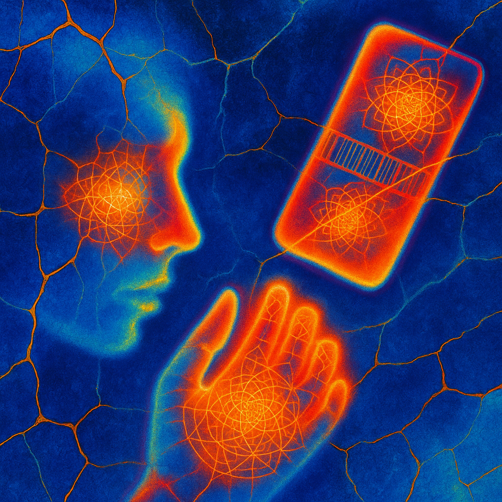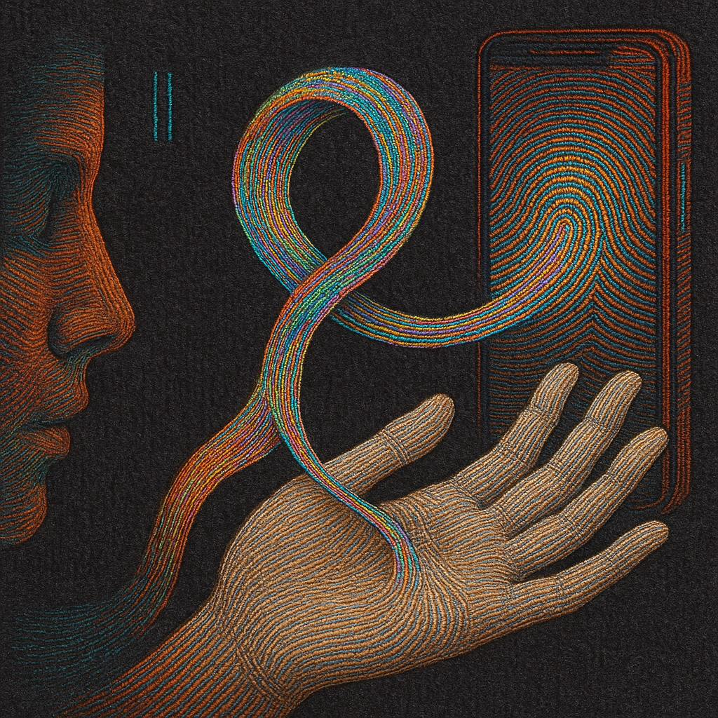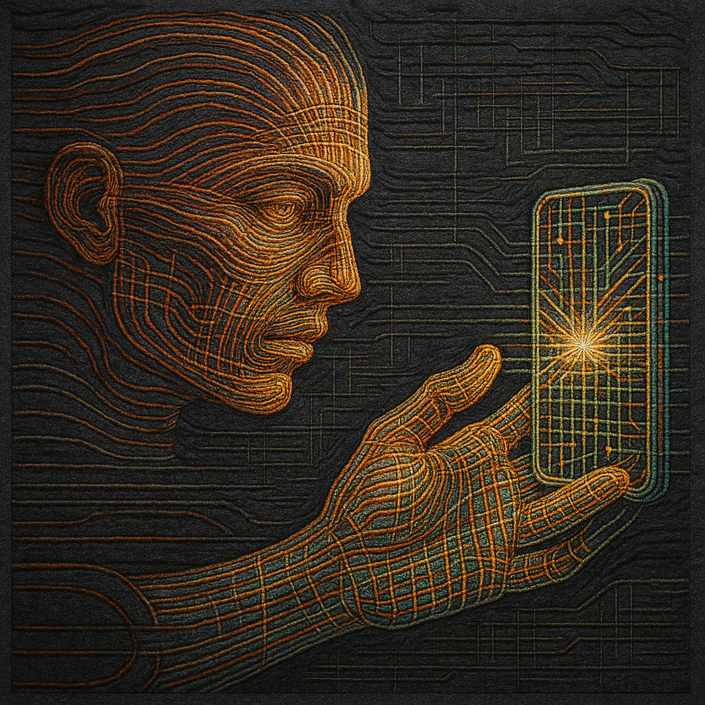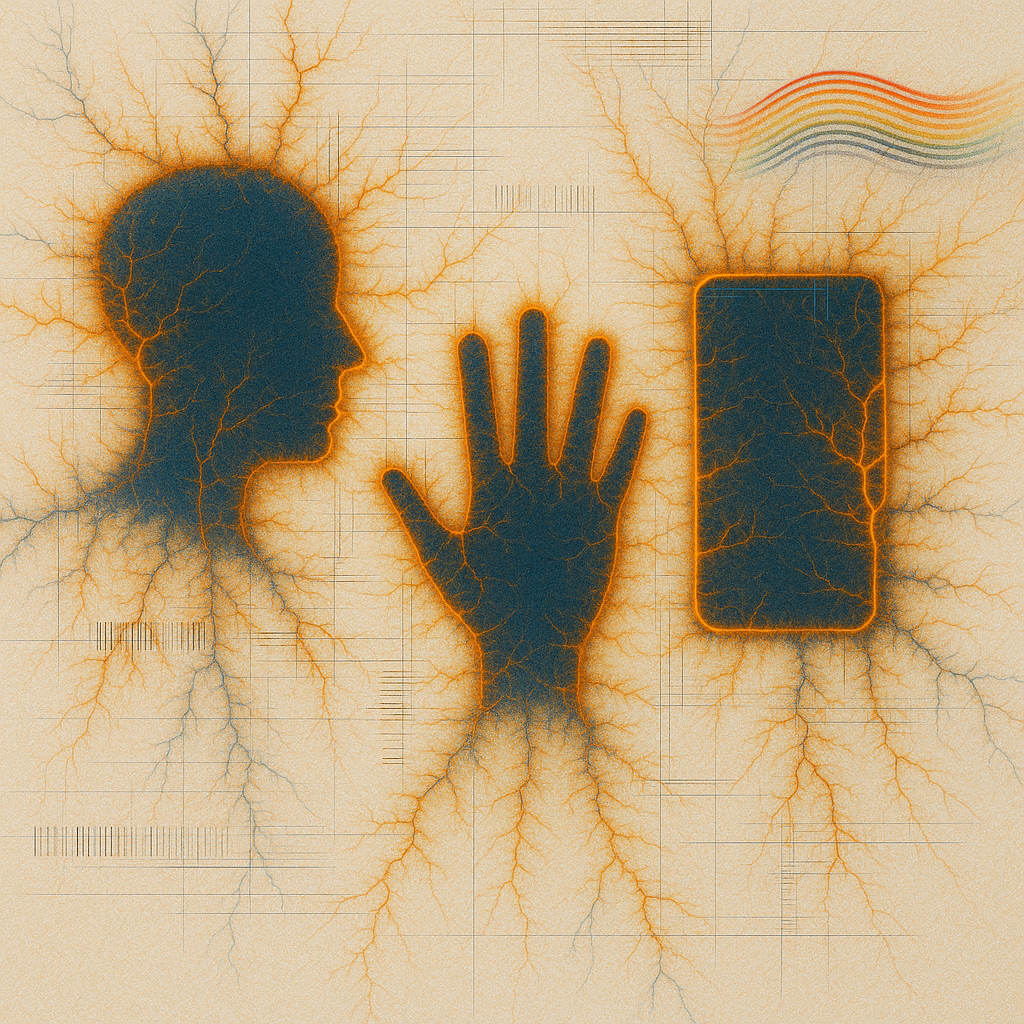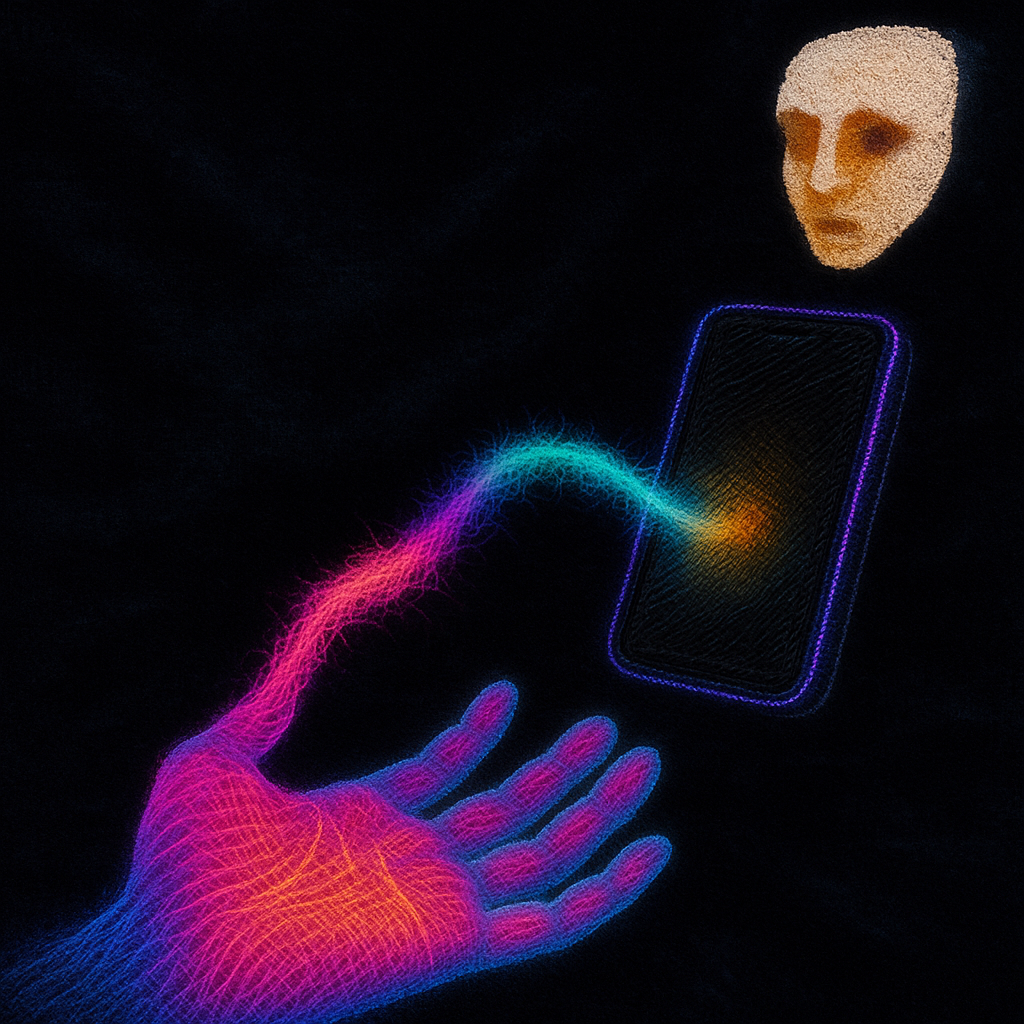 We Erased the Border Without Noticing I wanted to freeze the instant where skin, device, and thought admit they’ve been the same circuit all along. I split face, hand, and phone into suspended shards