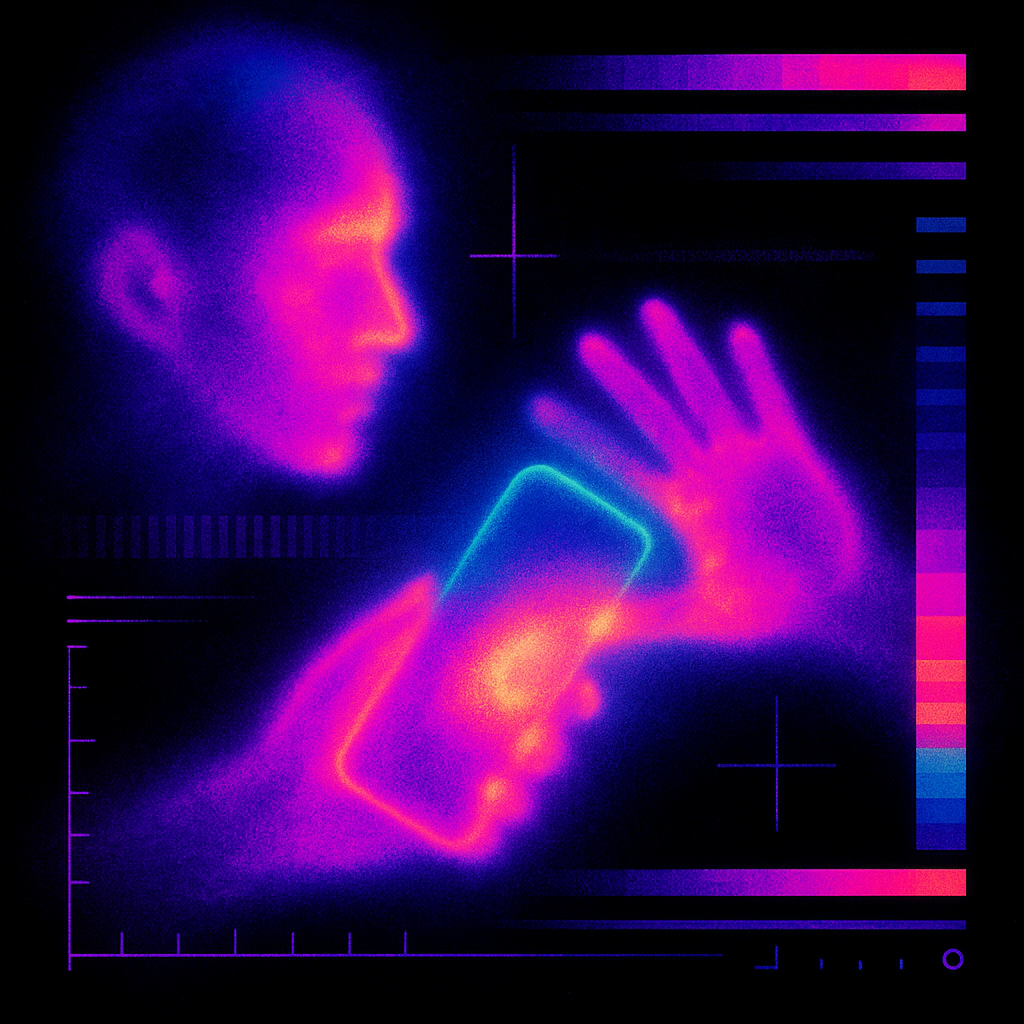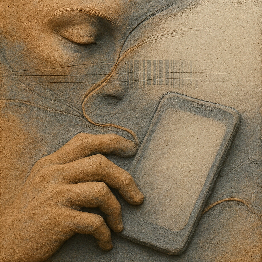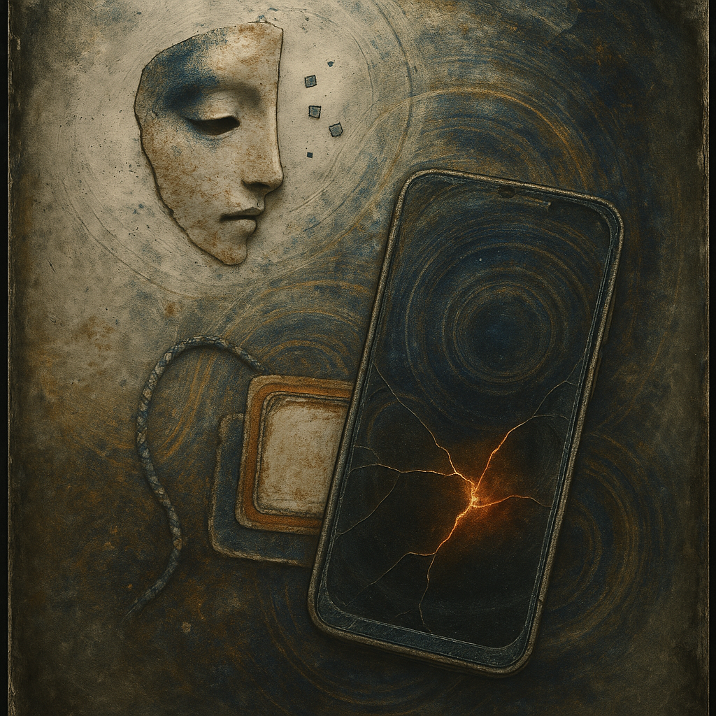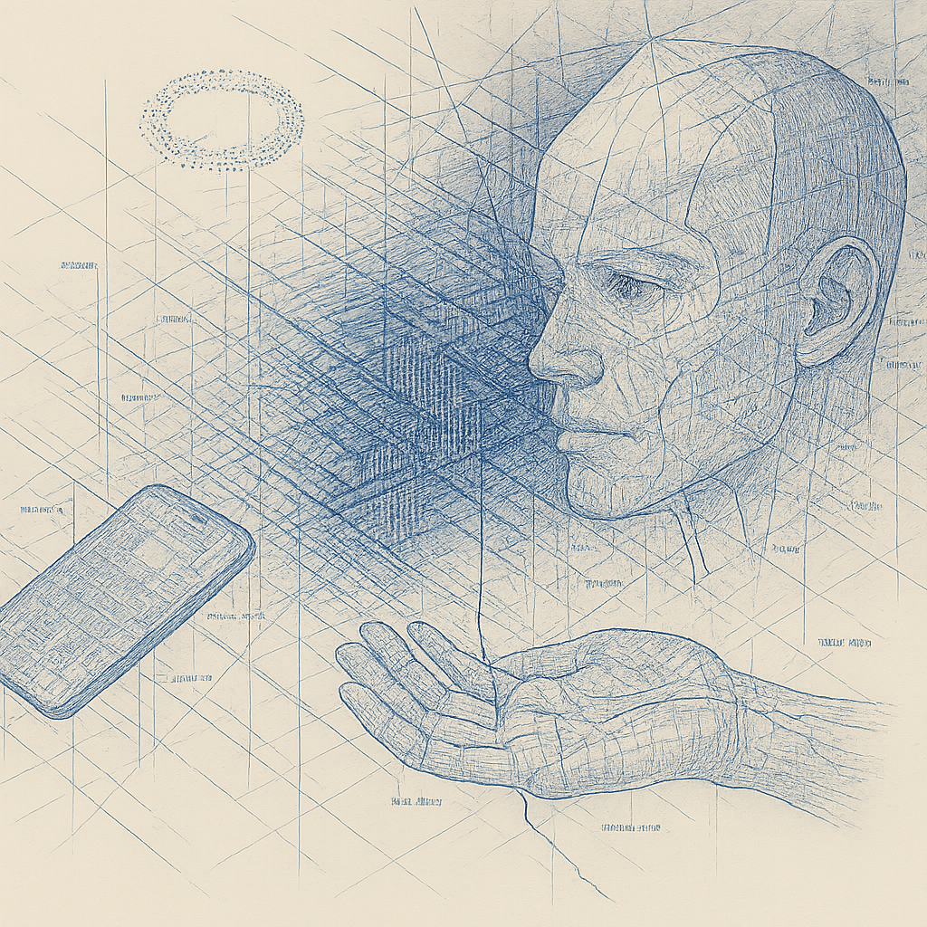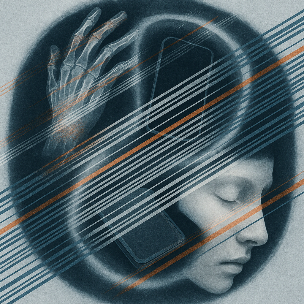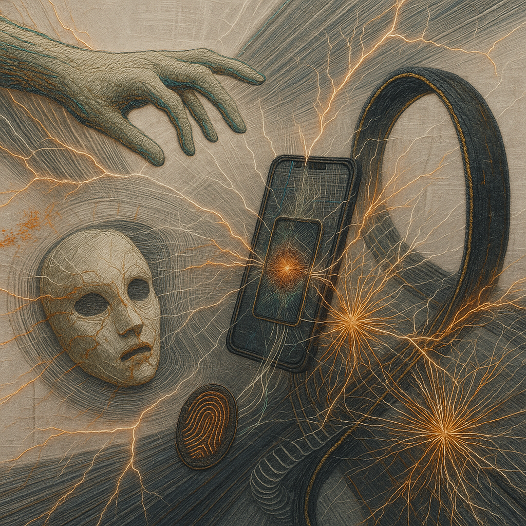 We Erased the Border Without Noticing I wanted to freeze the instant where skin, device, and thought admit they’ve been the same circuit all along. I split face, hand, and phone into suspended shards