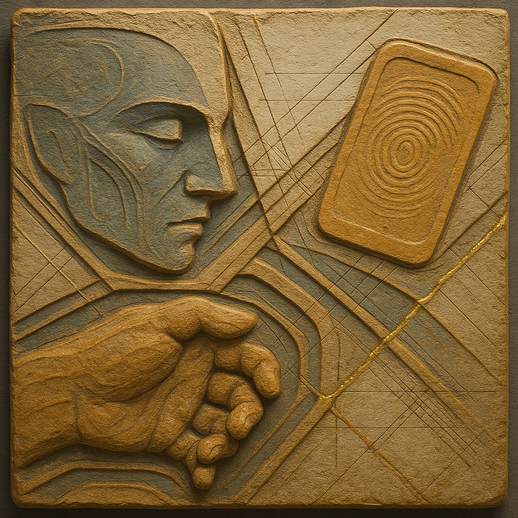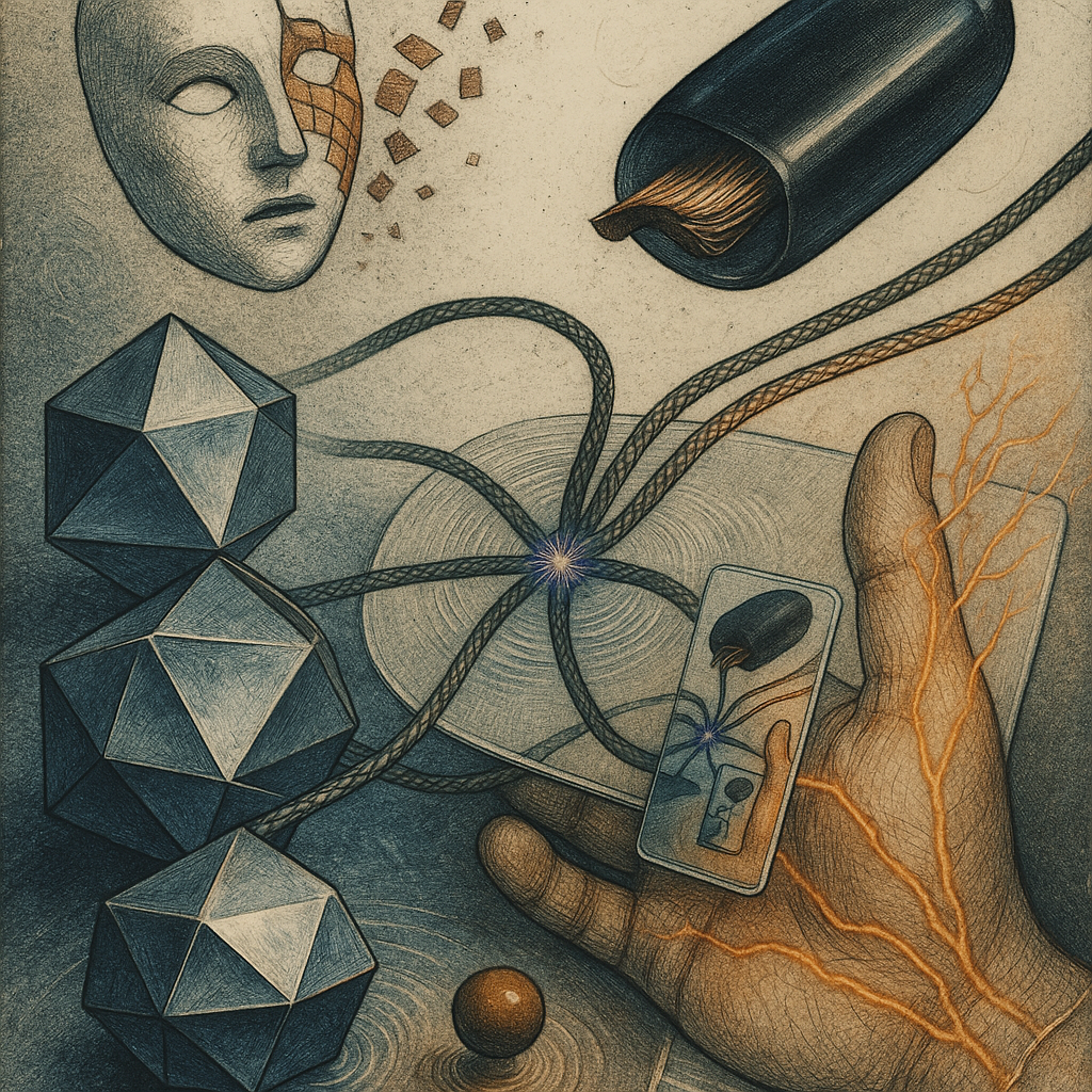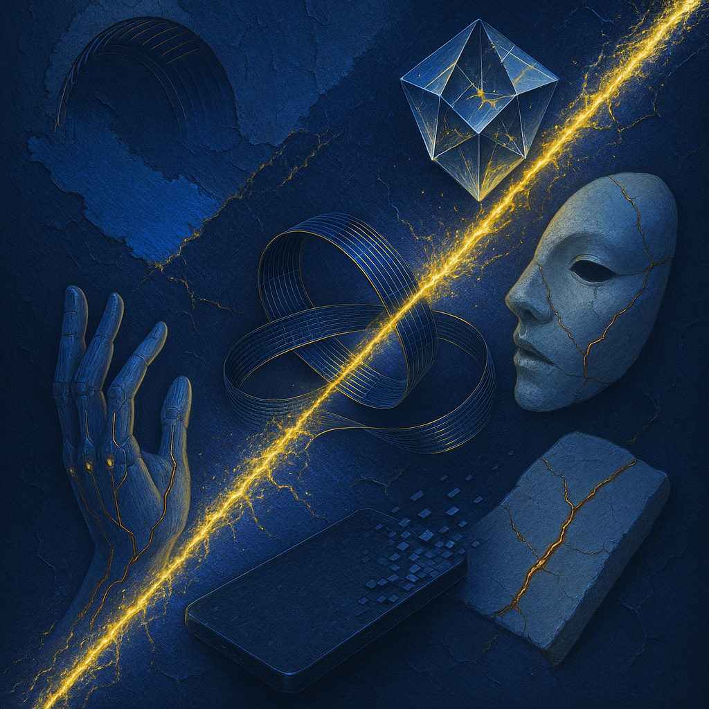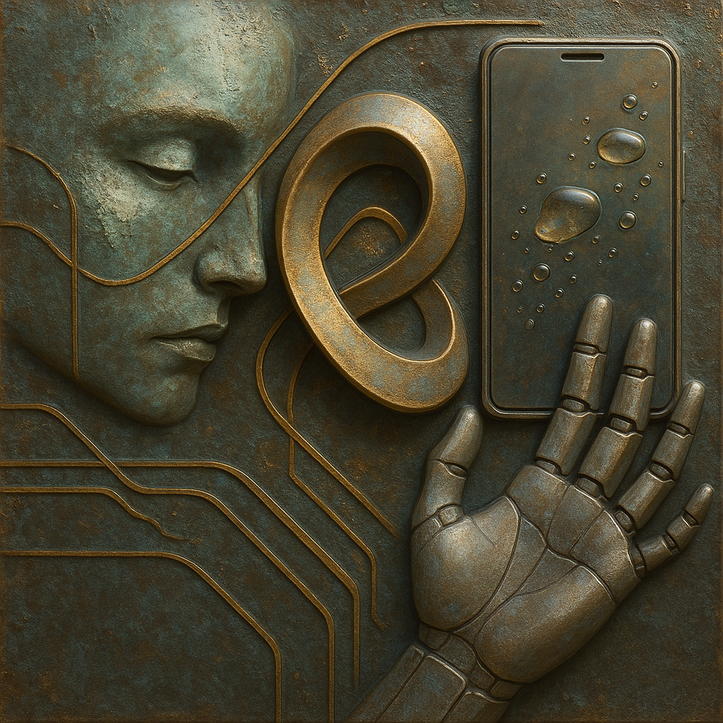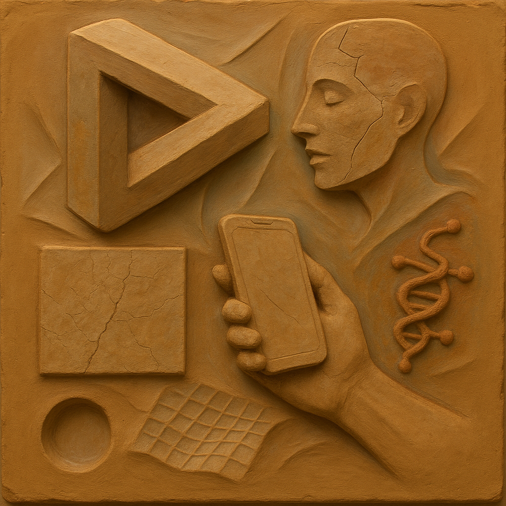 We Erased the Border Without Noticing I wanted to freeze the instant where skin, device, and thought admit they’ve been the same circuit all along. I split face, hand, and phone into suspended shards