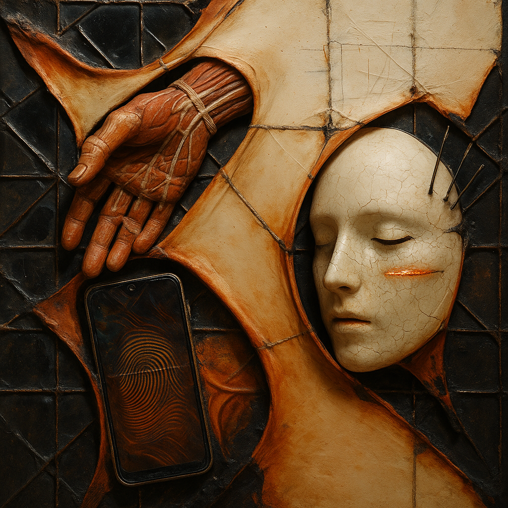 The Phone Was a Limb All Along I wanted to show that body, device, and habit aren’t separate objects but one nervous system already fused. I split a face, a hand, and a phone into suspended shards and