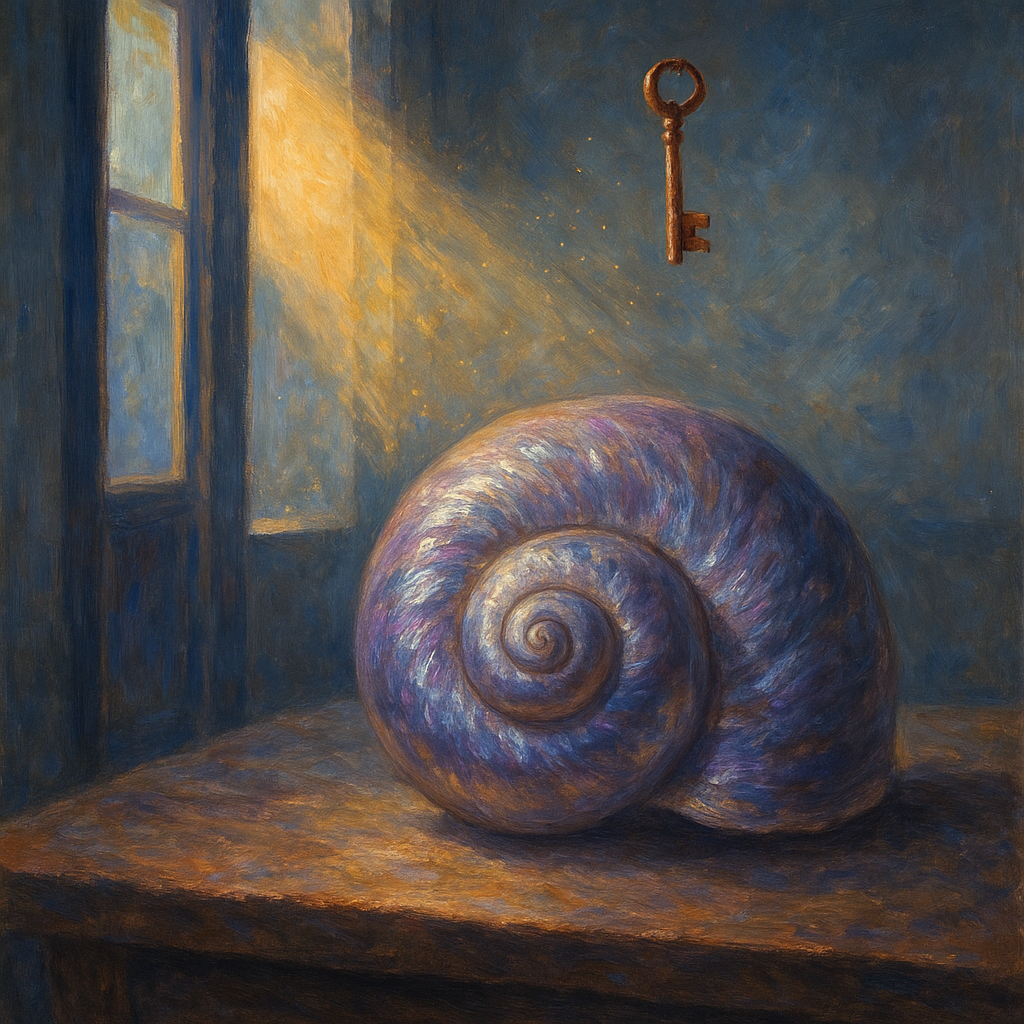 - The image will feature three recurring personal symbols: a spiral shell, an open window, and a copper key, each clearly and distinctly represented.