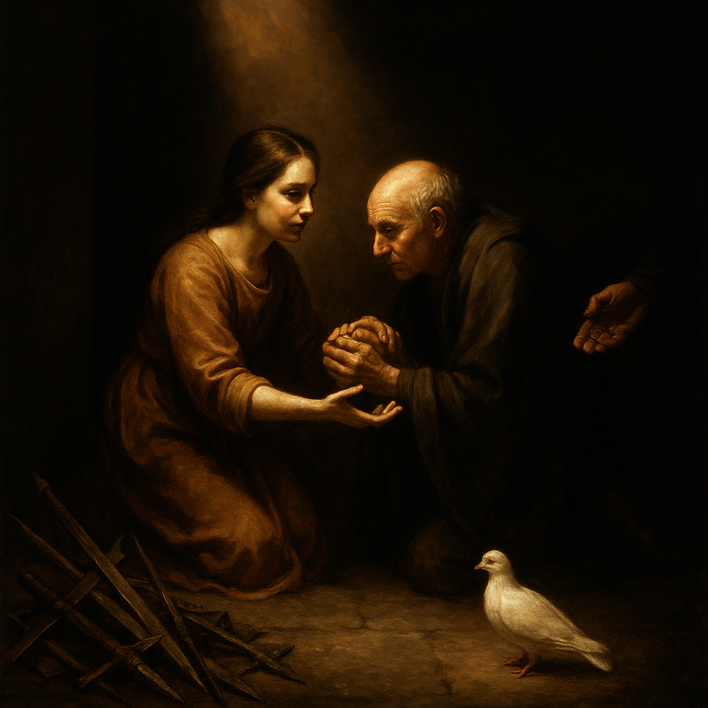 Inside a dim, Caravaggio-inspired chamber, a young woman kneels in the center, her face and open hands dramatically lit by an overhead beam of warm, golden light. She helps an elderly person up from the floor — their gesture is tender, and both faces are fully illuminated, exuding compassion and dignity. Beside them, a pile of rusted, sharp weapons lies in the near foreground, discarded, slipping into near-black shadow — their forms barely discernible, steeped in visual condemnation. On the righ