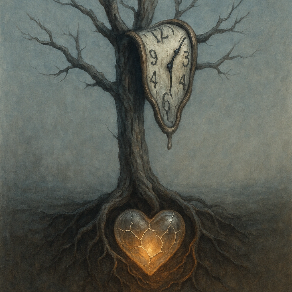 A barren, leafless tree stands center frame against a muted, foggy backdrop. Its bark is splintered and gray; branches twisted. Draped over a central branch is an oversized, melting clock, its warped face distorting the numbers, sliding toward the ground — a nod to Dali, but bleaker, to evoke the relentless, corrosive passage of difficult time. The tree’s gnarled roots snake down into the earth, where they clasp a transparent glass heart, large enough to draw the eye. The hear