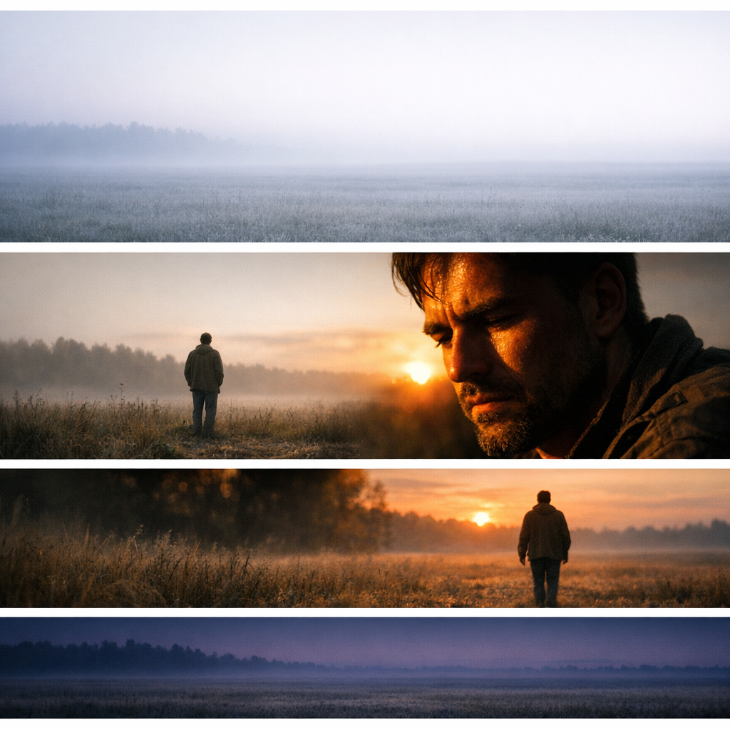 - Present a gentle transition image—a figure in the middle distance, framed by soft morning mist, with muted earth tones and subtle contrasts.