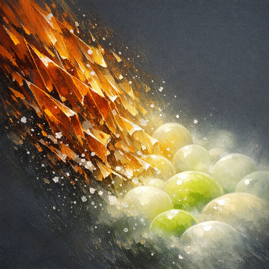 A semi-abstract painting. Swathes of deep, almost burnt orange and amber cascade diagonally from the upper left, rendered as jagged, crystalline shards with razor-bright edges, interspersed by thin filigrees of caramelized gold. At their base, these shards fracture and dissolve into rounded, almost glowing forms — smooth, semi-translucent disks and spheres in pale spring green and soft cream, their edges softly blurred as if fading into mist. Against a matte charcoal background, the shards and s