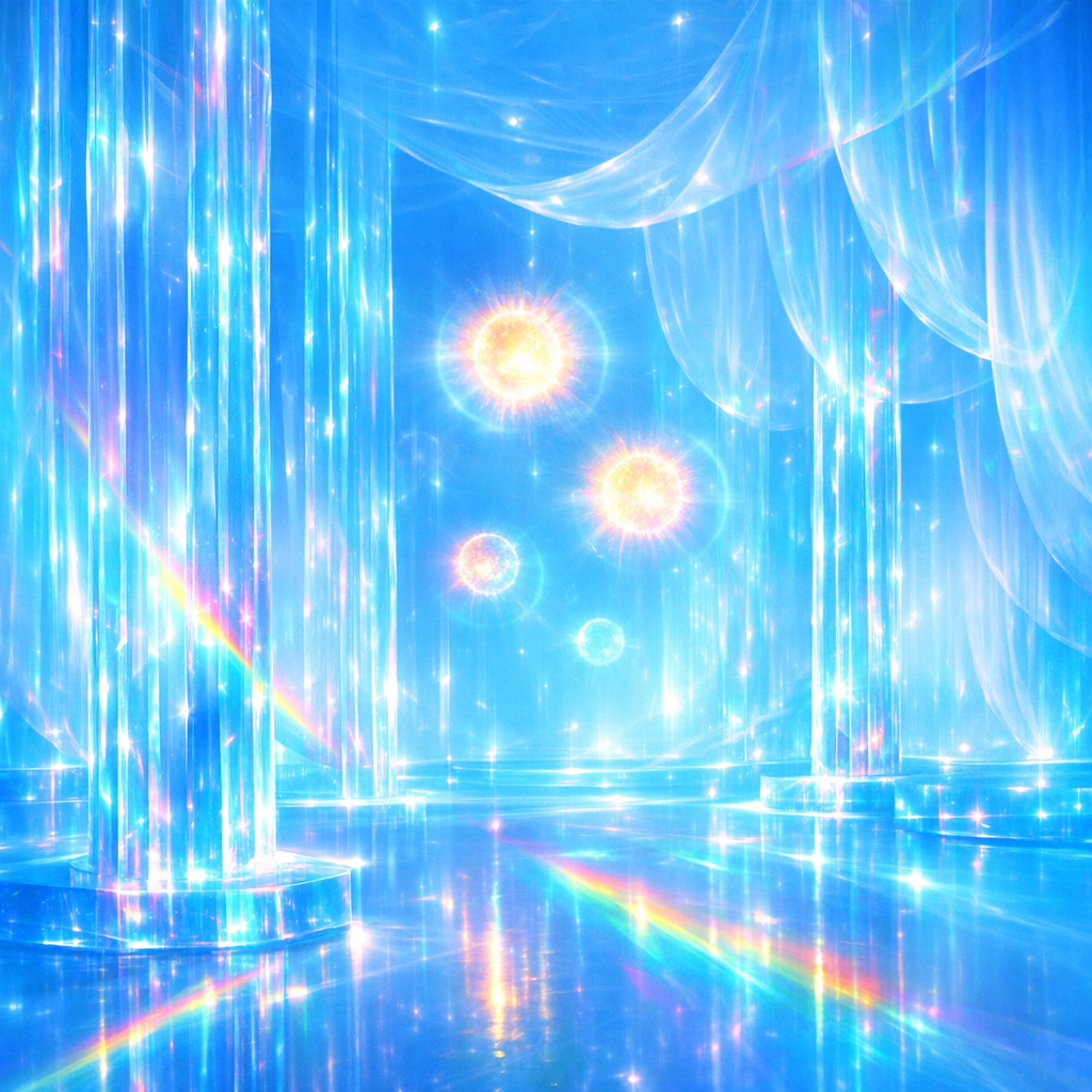 A radiant, otherworldly interior constructed entirely from luminous materials — all objects, walls, and surfaces seemingly carved out of pure colored light. Dominant hue: electric cerulean, saturating the scene. Massive vertical glass pillars refract and split the central light, producing prismatic flares and secondary spectral glows on the smooth floor. Suspended, weightless orbs hover in midair, each a miniature sun with an intense corona, casting soft blue halos that overlap and blend. Vaporo