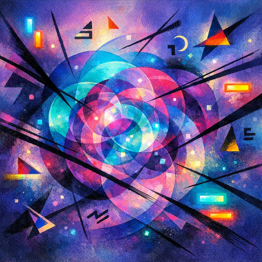 - Two explicit visual echoes of Kandinsky’s approach will be present: overlapping transparent circles and directional linear elements that create a sense of movement and visual rhythm.