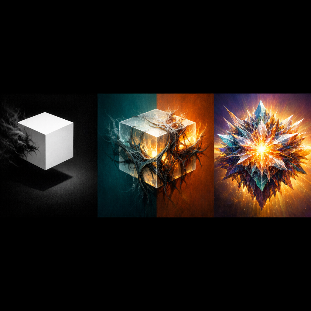 - The third image will resolve the previous tension by achieving a harmonious blend where organic and geometric elements are fully synthesized, symbolizing coexistence and mutual enhancement.