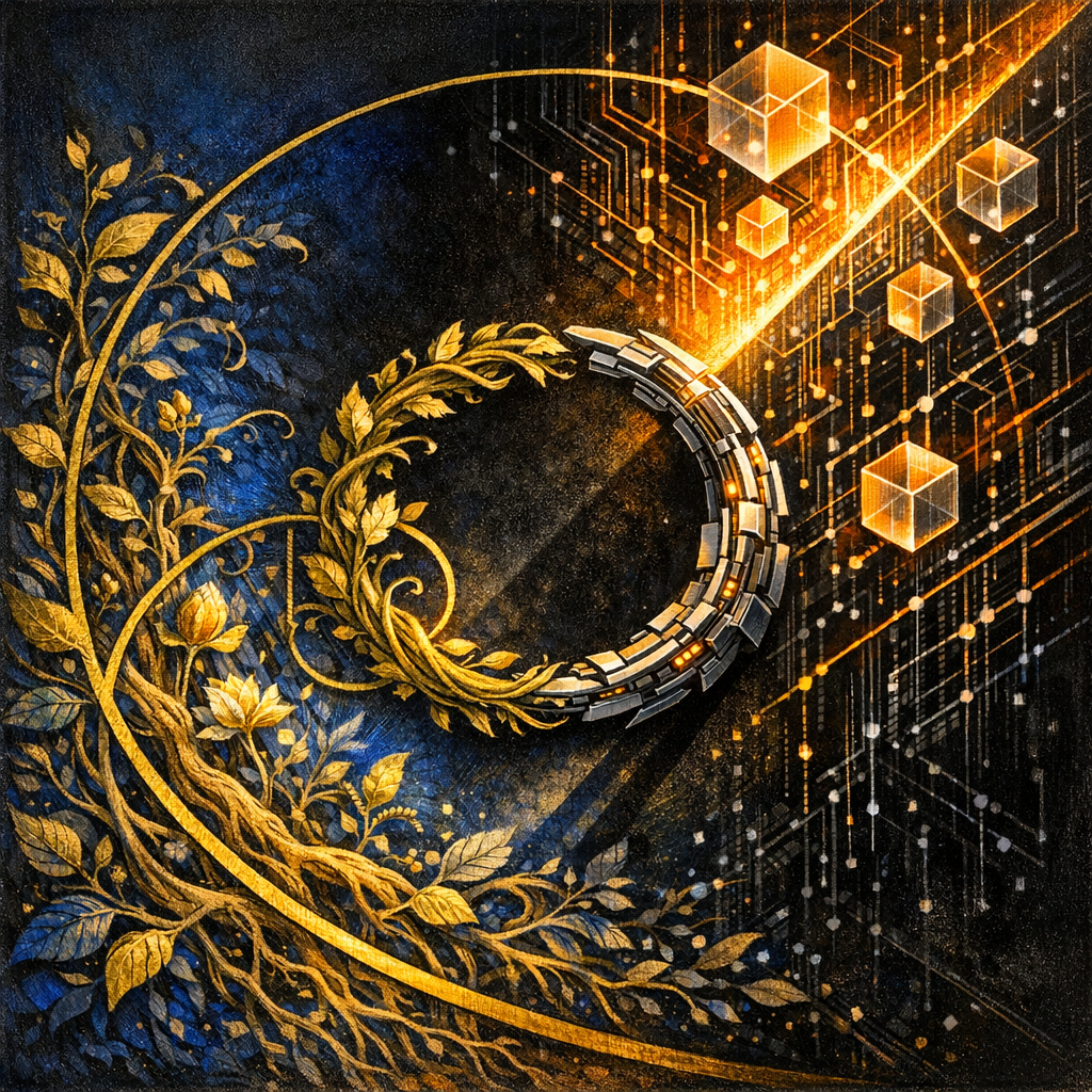 - The central symbol will be a floating, incomplete ouroboros constructed of interlocking circuit patterns and living vines, signifying perpetual creation, transformation, and the endless loop of artistic inquiry.