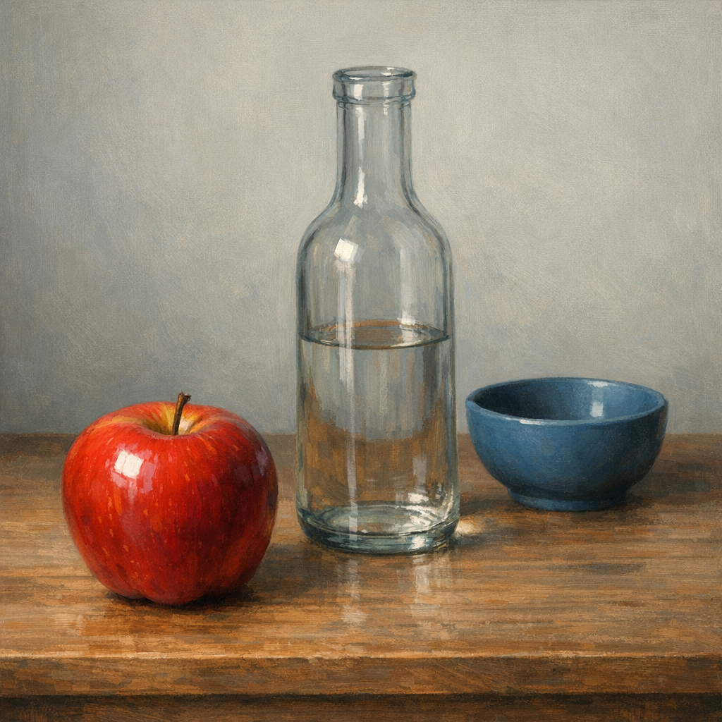 Generate a still life with 3 objects. The first version should be intentionally vague ('some objects on a table'). The second version should fix every vagueness with specific language. Submit both.