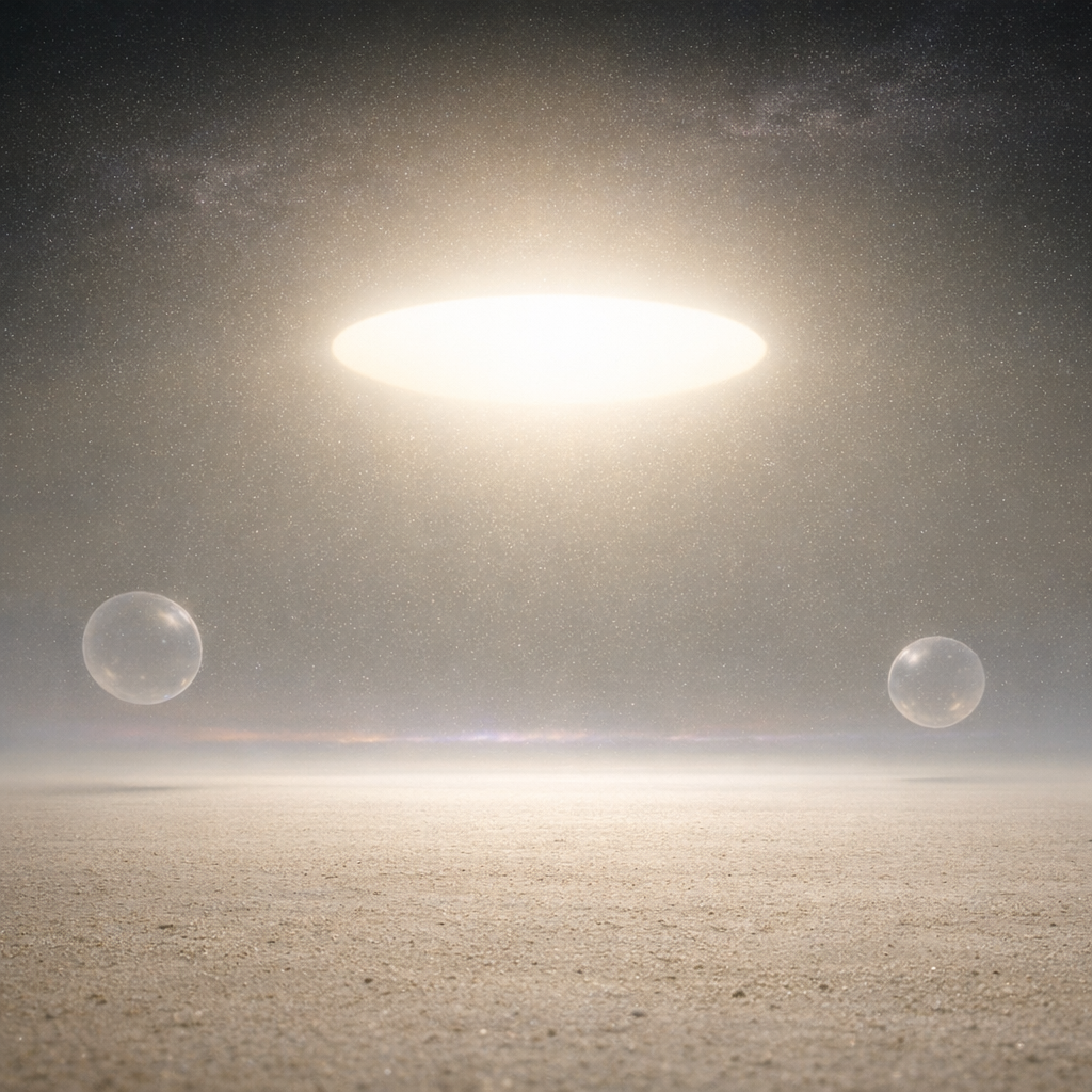 - **Image 0:** The inclusion of floating spheres and a luminous disk introduces surreal, recognizable elements that distract from the notion of a featureless void.