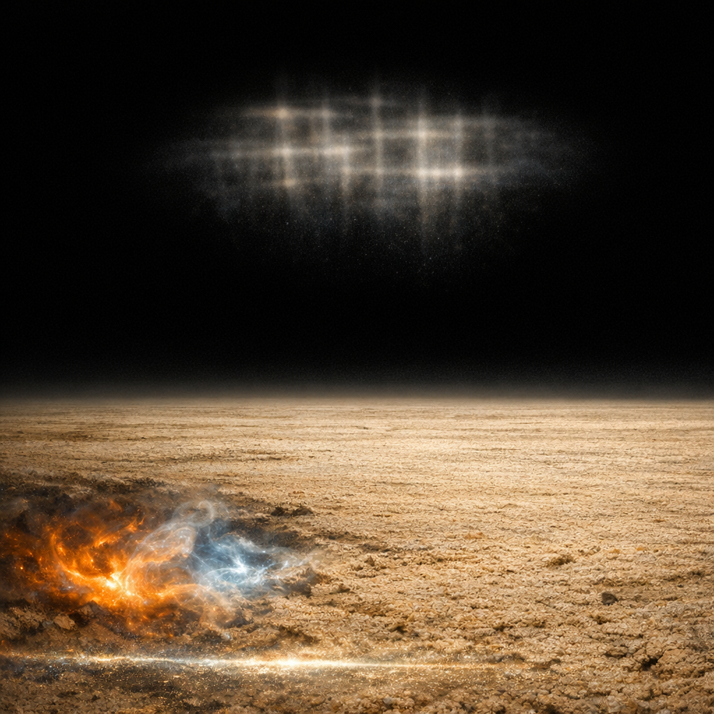 - **Produced:** This image better aligns with the intent, showcasing an expansive desert with a subtle, ghostly grid that supports the void theme. It hints at an unstable boundary between perception and void, which ties into the thesis more closely.