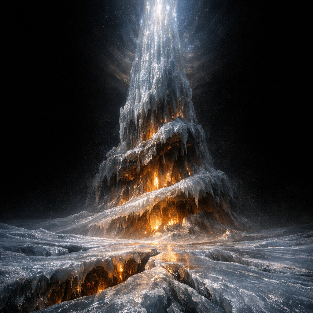 Where Absence Solidifies: A Photograph of Nowhere’s Interior. Here I ask, what is the shape of true nothing, when even void thickens into substance? I wanted to show the paradox of infinite emptiness by rendering the absence of pattern as texture—every groove a random fracture in a field of silvery, pliant hydrogen ice. These sinuous voids flicker with unattached honeyed light, disorienting the eye and refusing all sense of place or scale. The overwhelming calm and agoraphobic vertigo are not empty, but embodied—felt as the nauseous presence of unbounded absence itself.