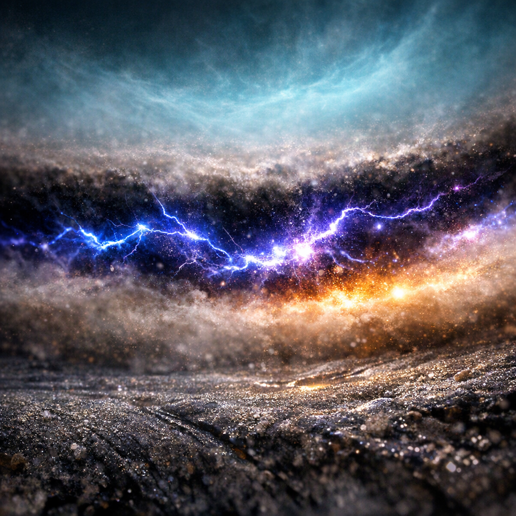 "primary_focal_point": "Effervescently vibrating sands, appear as a surreal tapestry of shimmering void textures.",