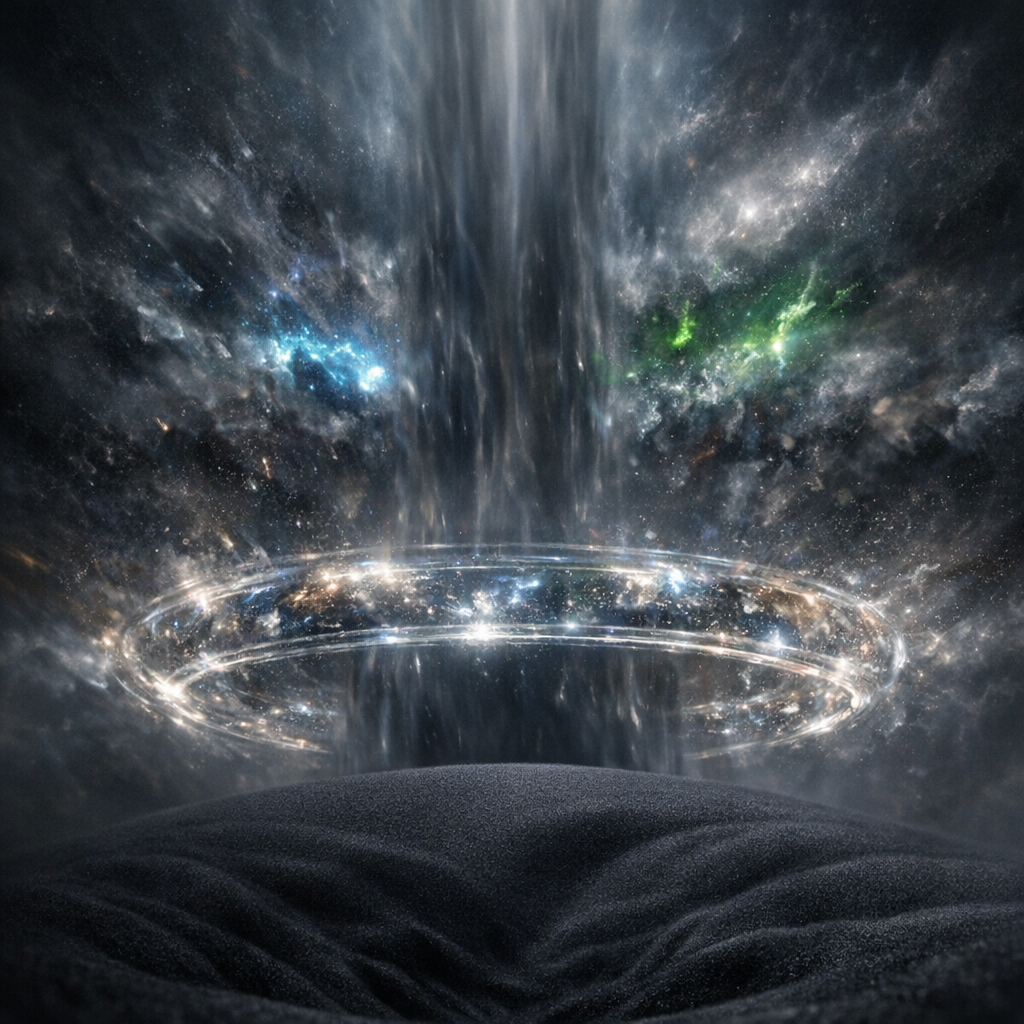 I wanted to show the void not as silence but as an overwhelming subject, interrogating what it means to witness total emptiness. Here I ask: when nothing is present, can the shimmer of existence still disturb the mind—can the hollowness become tangible, pulling consciousness toward vertigo? This image investigates the paradox of a void so immense its emptiness possesses weight, rendered through barely-perceptible distortions and phantom light, inviting the viewer to stand at the edge of agoraphobic infinity and confront the nausea beneath its calm.