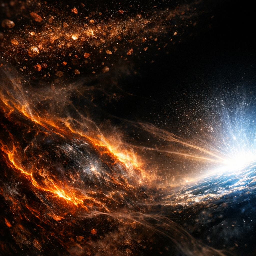 The Suspended Weight of Emptiness as Substance. Here I ask what it means for nothingness to acquire texture and presence: could emptiness itself press against the senses, leaving only the languid drift of dust as evidence? I wanted to show the void at a scale both macroscopic and minute, where fine, iron-hued particles hover like a memory of matter amid absence, suspended in light harsh enough to reveal every grain. The unsettling, vertiginous calm arises when the smallest disturbances become monumental, and the eye begins to fall through micro-scale infinity.