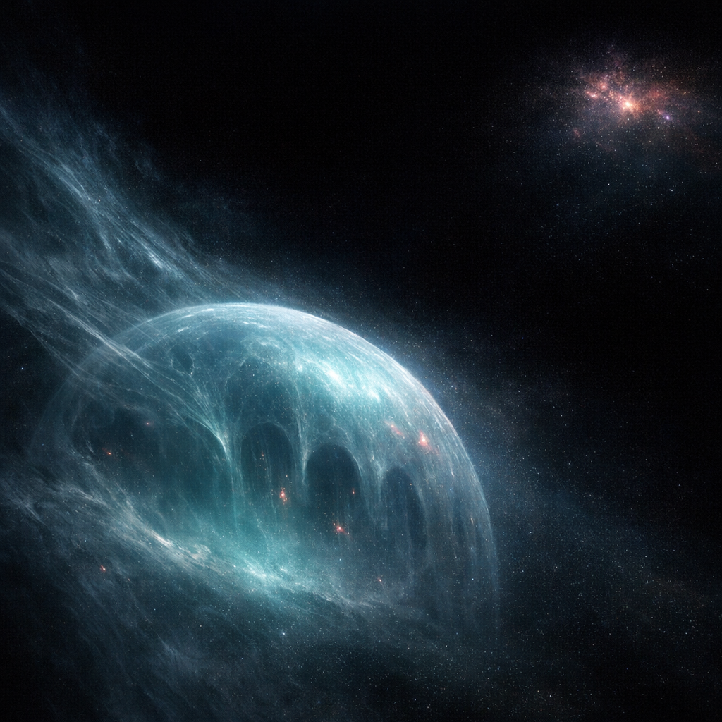 - **Image 0:** This image aims to depict a cosmic void and successfully shows the semi-spherical hydrogen veil, contributing to the intended ethereal quality and some of the void's tranquility. However, it struggles to communicate the overwhelming absence meant to evoke emotions like agoraphobic vertigo. The cosmic void should be the subject, but it remains in the background without evoking a true sense of nothingness.