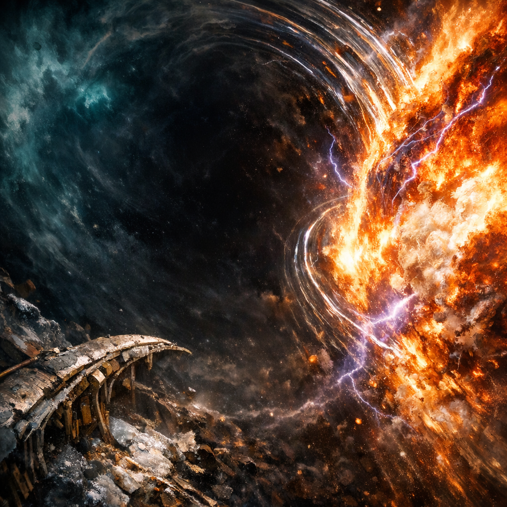 The goal was to visually depict the idea of a cosmic void—a space characterized by absolute emptiness—by focusing on texture to suggest vast emptiness without relying on recognizable cosmic motifs. This should evoke feelings of agoraphobic vertigo, the nausea of infinite emptiness, and a disturbing calm, using a palette akin to a polar aurora and structural fragmentation to simulate gravitational lensing.