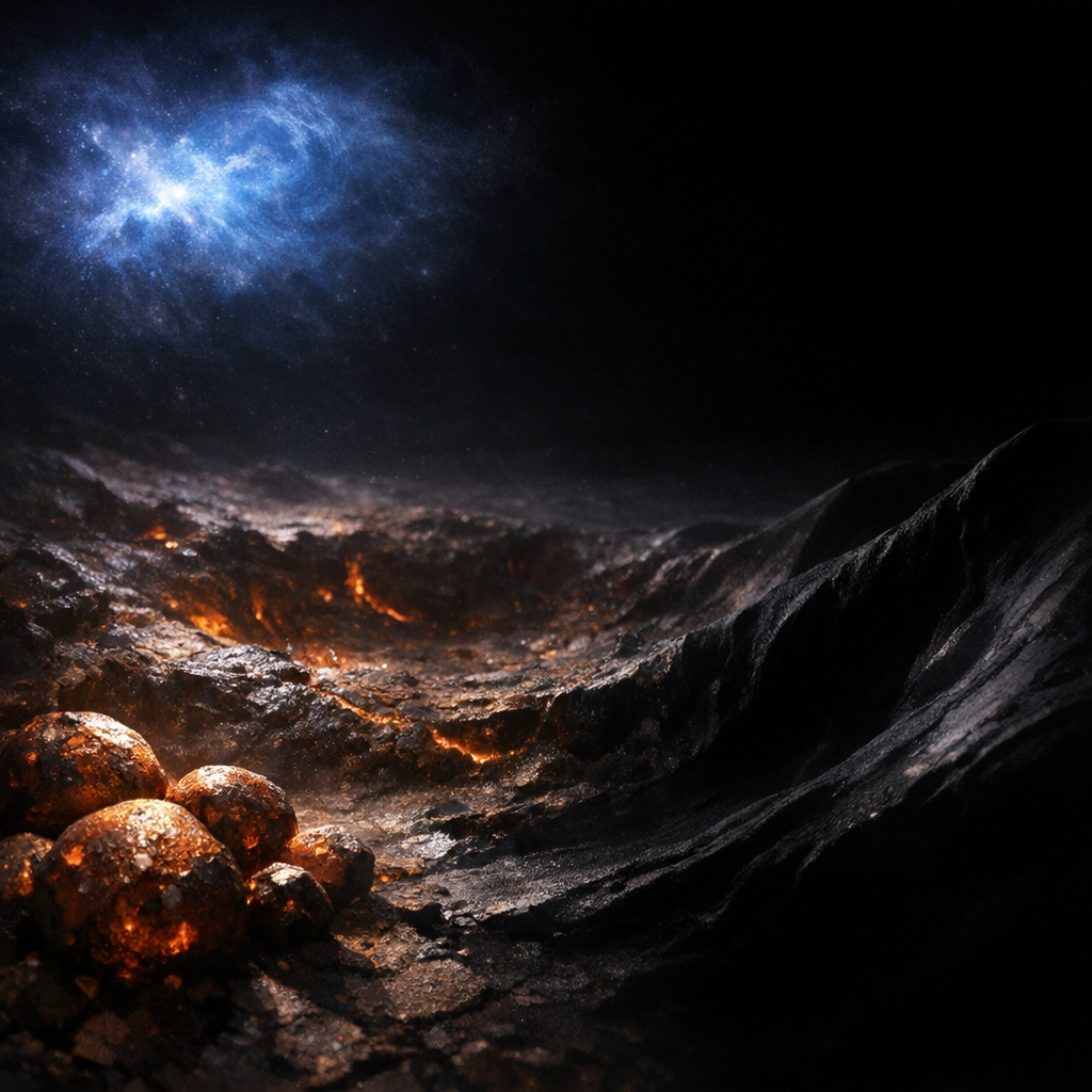 - **Produced:** Image 0 predominantly features a textured rocky surface with glowing orange cracks indicating underlying heat or magma, clustered molten orbs, and a diffuse blue nebula. Image 1 presents a strong diagonal split with a volcanic surface on one side and a radiant cosmic explosion on the other.