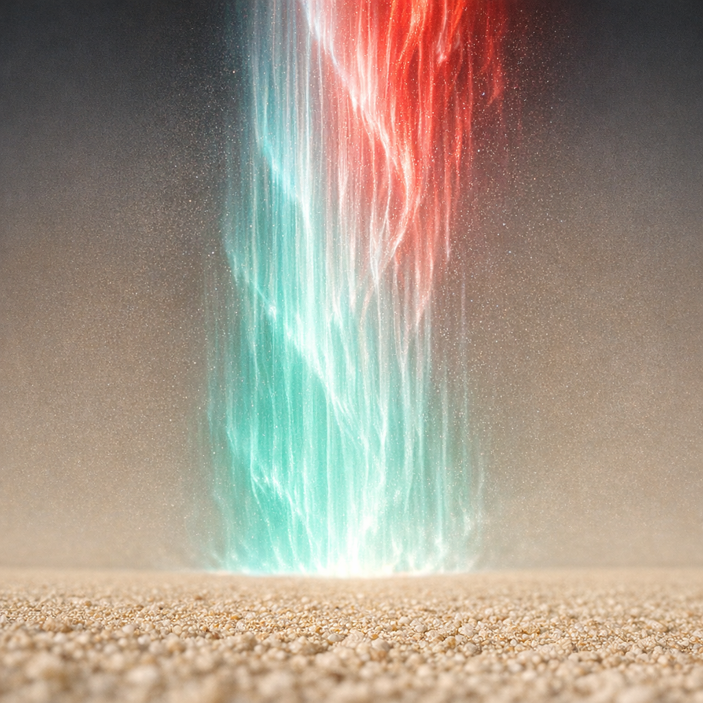 - **Produced:** The image features a detailed column of light within a desert context, integrating cosmic motifs that detract from the void-centric thesis.