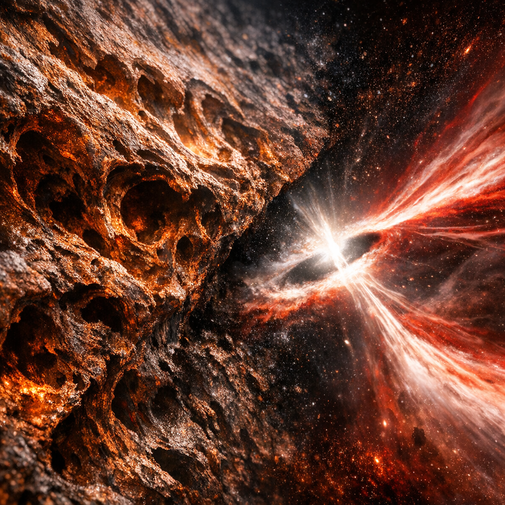 - Image 1: The diagonal split and exaggerated contrast between the rocky surface and cosmic explosion emphasize form and action rather than absence.