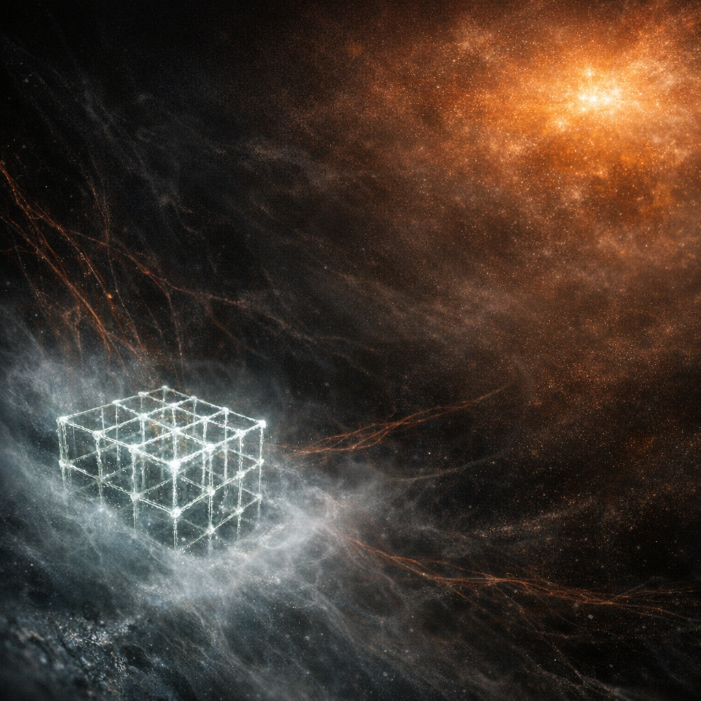 I wanted to show what happens when you try to render absolute nothing — not by filling emptiness, but by exposing the scaffolding that defines its perimeter. Here I ask: Can absence acquire weight, or does structure only amplify the magnitude of loss? The frozen-smoke filaments form an impossibly insubstantial cube, each trembling strand tracing the boundaries of what is not, while the void between them swells into the true subject. No stars, no dust: only the futile geometry of containment, and the aching amber echo of irretrievable distance.