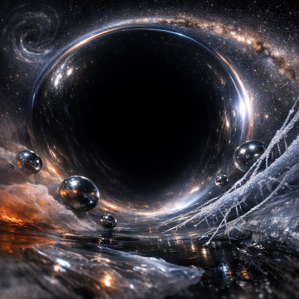 "style_chosen": "Reflective cosmic void with gravitational lensing",
