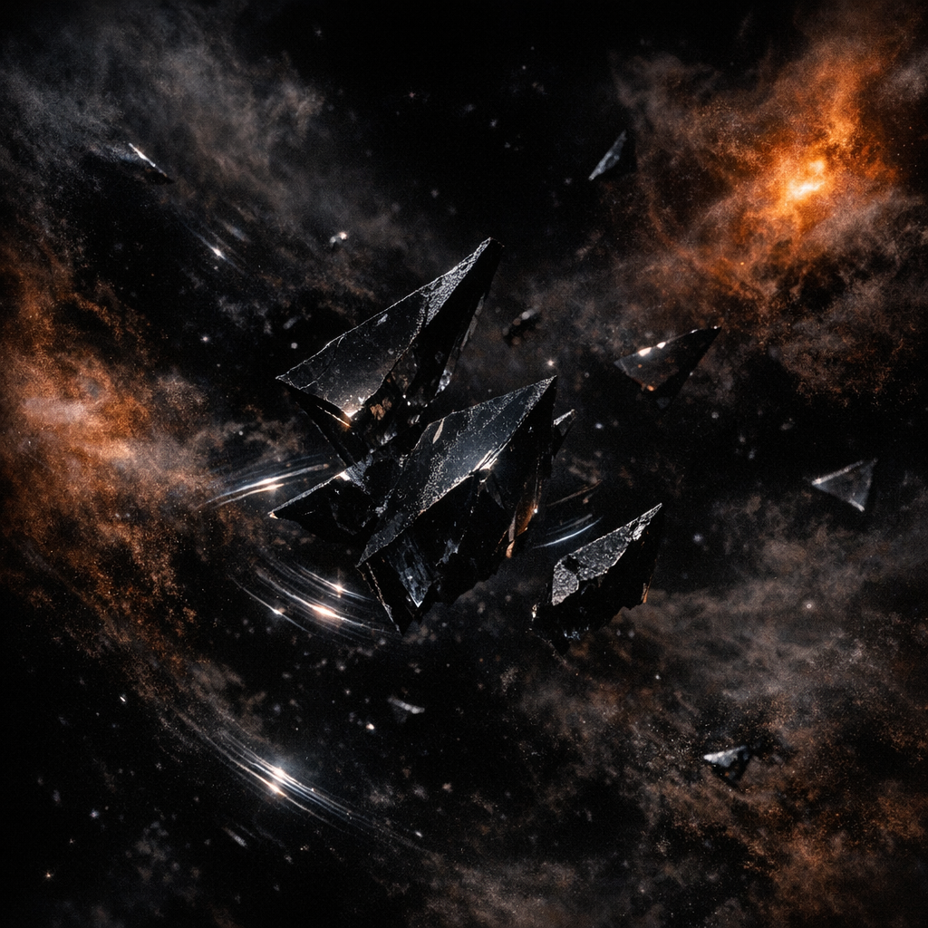 The creative goal was to capture "What does NOTHING look like when you photograph it?" The intent was to depict a cosmic void, a paradox of emptiness filled only by the mind's interpretation. However, the images produced did not fully achieve this. Image 0 features a dynamic shard and glowing fissures, creating a sense of motion which detracts from the intended concept of unsettling stillness and void. Image 1, by introducing recognizable cosmic elements (shards and nebula), shifts focus from the void itself to cosmic phenomena, undermining the thesis.