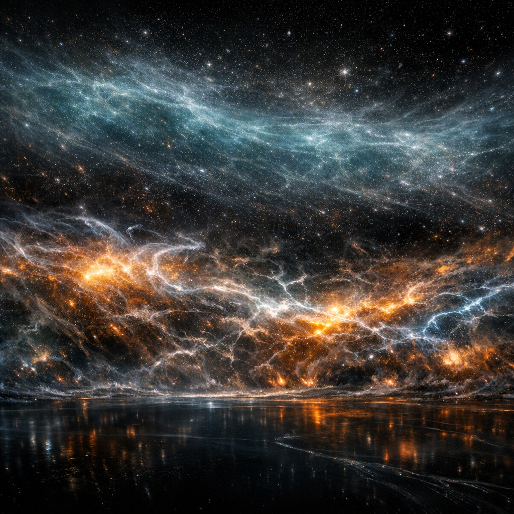 I wanted to show what it means for a boundary to never arrive, how presence dissolves in a field that refuses to be seen. The ocean of gelid nitrogen is not a landscape but a denial of surface; its smoothness absorbs both light and meaning. Here I ask: can the suggestion of a form be enough to haunt the mind with the ache of its perpetual absence? The elusive bioluminescent hints, each a failed constellation, flicker just long enough to make you aware of all you cannot grasp. This image investigates a void so whole it erases the possibility of edges — aiming to evoke vertigo, silence, and the dread of endless, unmarked distance. Avoid all iconic nebulae, avoid classical starlight sparkle, avoid anything that provides the eye with a definite anchoring shape.