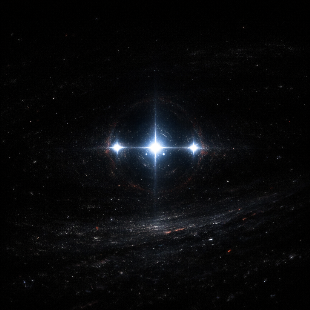 A. GOAL vs RESULT — The intended creative goal was to visualize the concept of 'nothingness' in the form of cosmic voids dominated by subtleties of light and shadow, intending to evoke feelings of disorienting emptiness and existential reflection. Image 0 focused too much on the recognizable cosmic structure of an Einstein cross, which, while