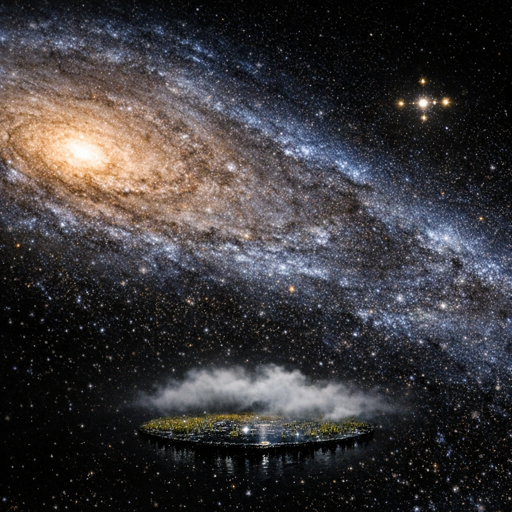 - **Intended:** The central goal was to render the concept of a cosmic void, using abstract gradients and textures to evoke emotions of agoraphobic vertigo and disturbing calm. The composition aimed to make the void a presence, not a background, while using a paradox prism to create a kaleidoscope of infinite reflections and employing a JWST infrared warmth palette.
