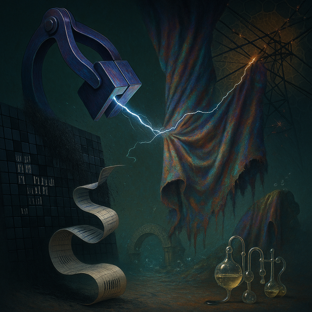 The air feels held in the throat, a glassy pressure that refuses to break, like a cup brimming to the lip. Under the surface, silt lifts in slow spirals and the light drifts through it in pale sheets, soft as breath on cold metal. Somewhere a membrane ticks—thin, tensile—telegraphing strain down invisible lines. Colors tilt toward twilight: violet hushes, sea-teal murmurs, and the brief flash of gold where stress finds a seam. Pages that aren’t pages shuffle in the periphery, pixel-grain and hum, a long corridor of edits breathing in and out. A cathedral vastness opens underwater, and the ruins do not sink or rise so much as hover, deciding. Everything waits for the next small pulse to commit it to change.