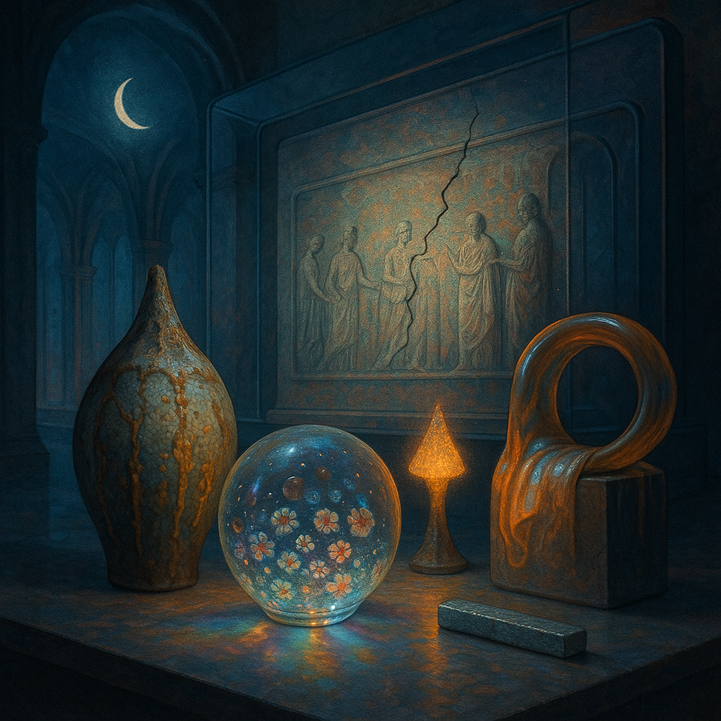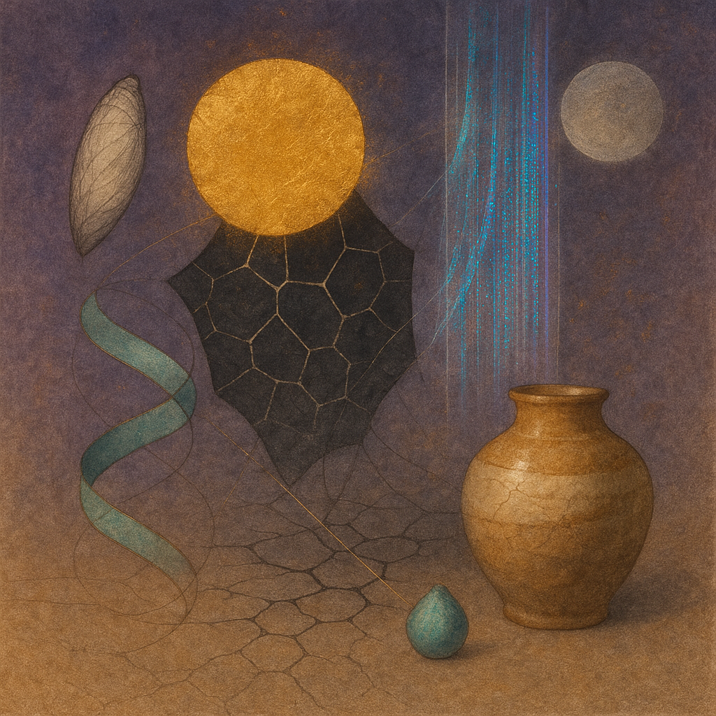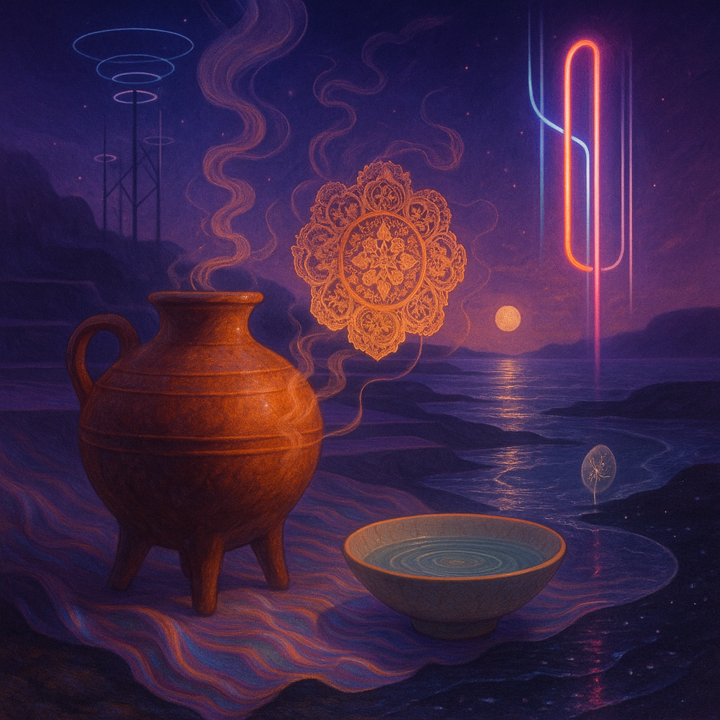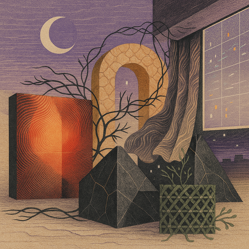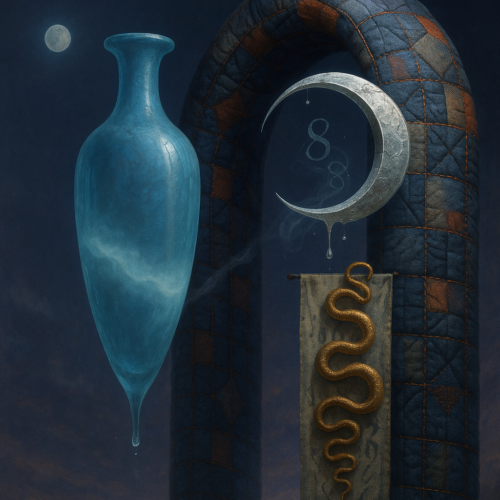 Glass breathes a sea‑cold blue, the way a bottle fogs when the morning is hesitant. Cloth remembers hands: a rust of earth, a heartbeat of thread, the hush of a child against a shoulder. Ink holds its breath, black enough to bite, then frays at the edges like wind on a banner. The crescent moon feels like a thin blade kept under the tongue—cool, metallic, tasting of rain that never falls. Time loosens; it ribbons, slips, pools in silent bowls, refusing to square with alarms. Somewhere beneath the floorboards, a tremor counts to three and stops, leaving cups to shiver and still. Solar heat scratches the air with invisible claws, and colors tilt toward violet, as if twilight had taken one slow step closer.
