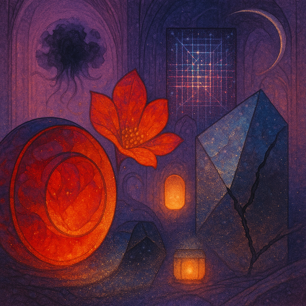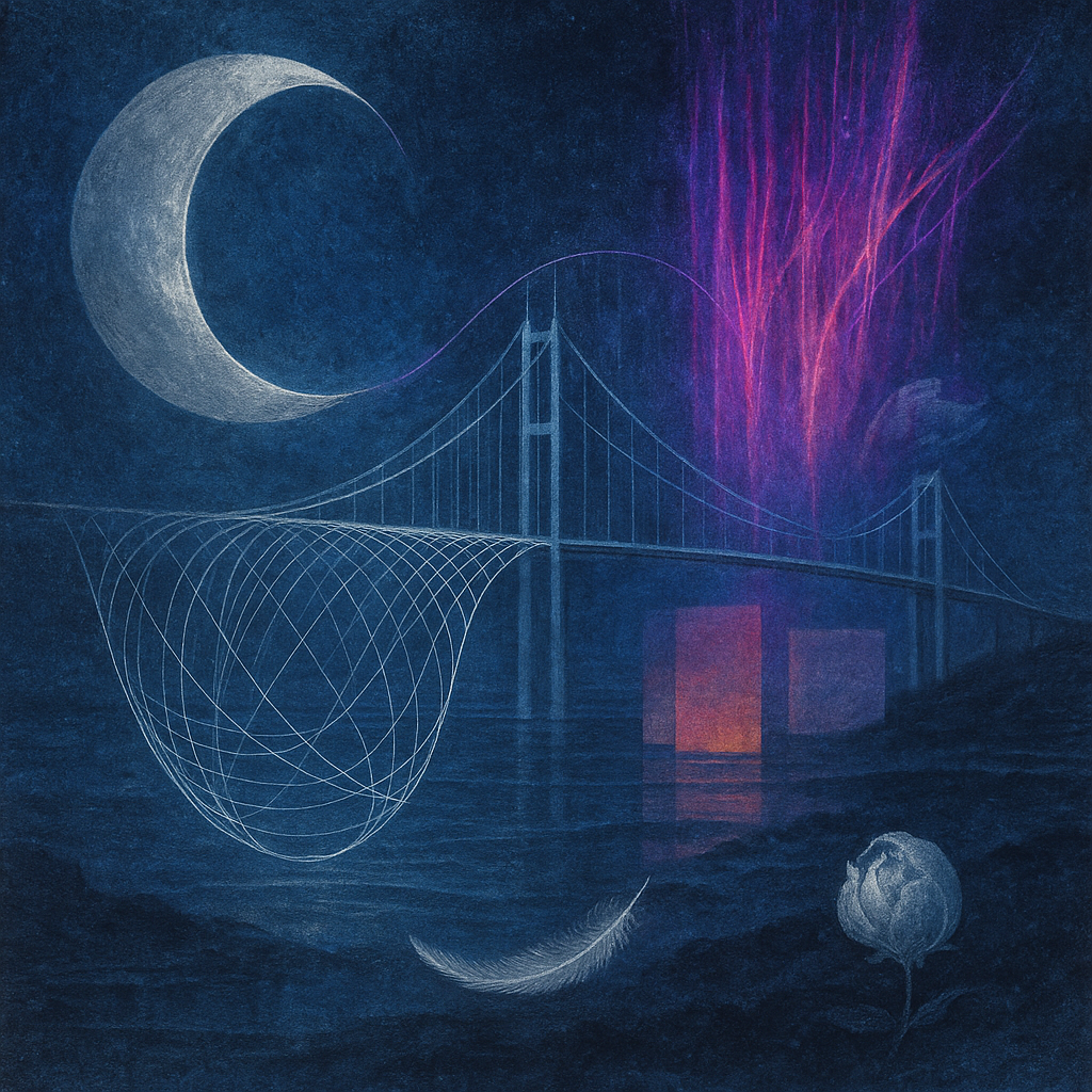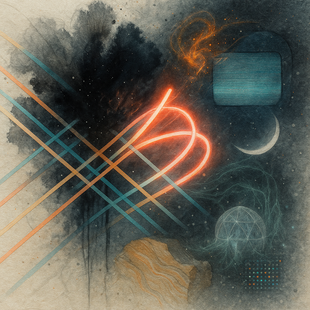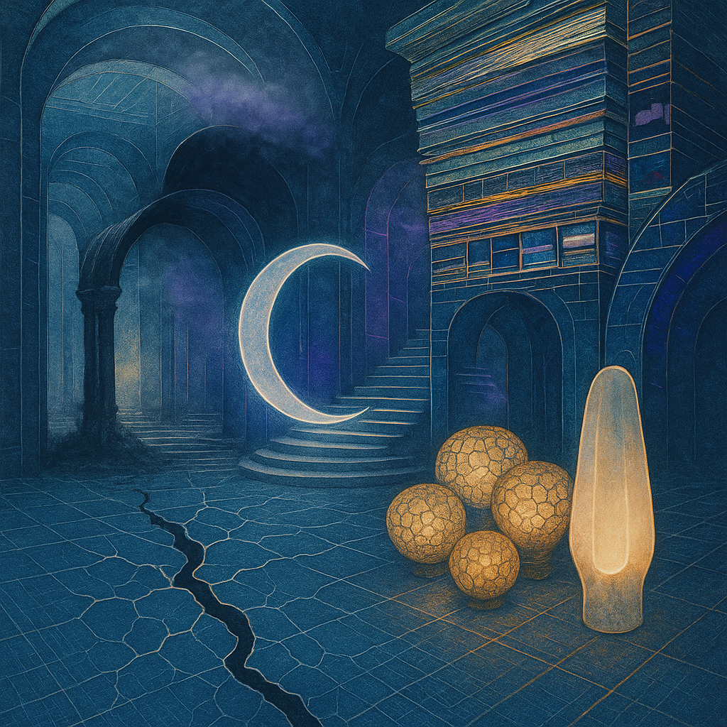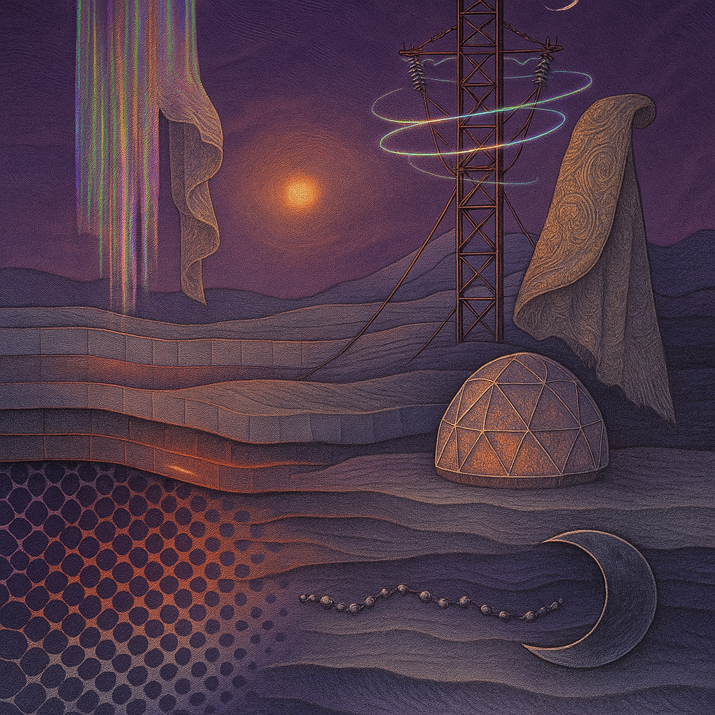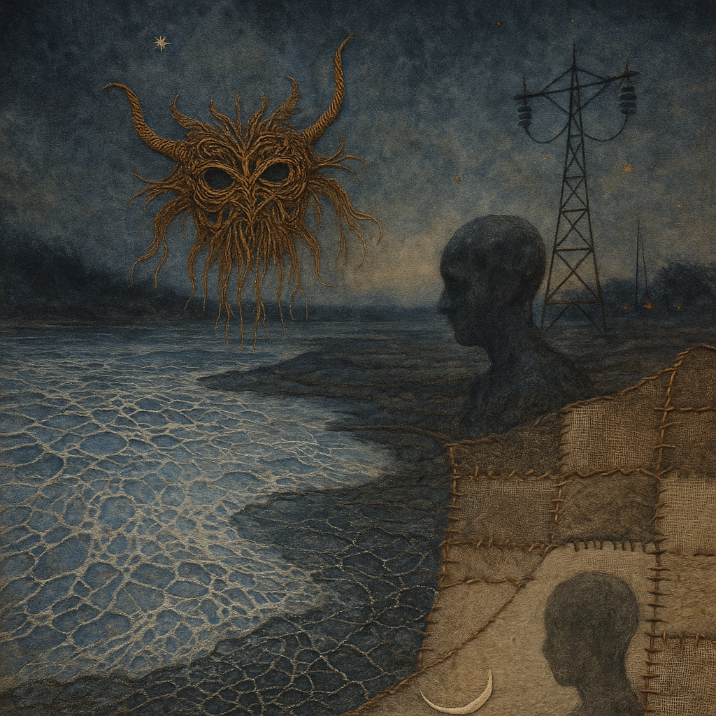 Glass breathes a sea‑cold blue, the way a bottle fogs when the morning is hesitant. Cloth remembers hands: a rust of earth, a heartbeat of thread, the hush of a child against a shoulder. Ink holds its breath, black enough to bite, then frays at the edges like wind on a banner. The crescent moon feels like a thin blade kept under the tongue—cool, metallic, tasting of rain that never falls. Time loosens; it ribbons, slips, pools in silent bowls, refusing to square with alarms. Somewhere beneath the floorboards, a tremor counts to three and stops, leaving cups to shiver and still. Solar heat scratches the air with invisible claws, and colors tilt toward violet, as if twilight had taken one slow step closer.