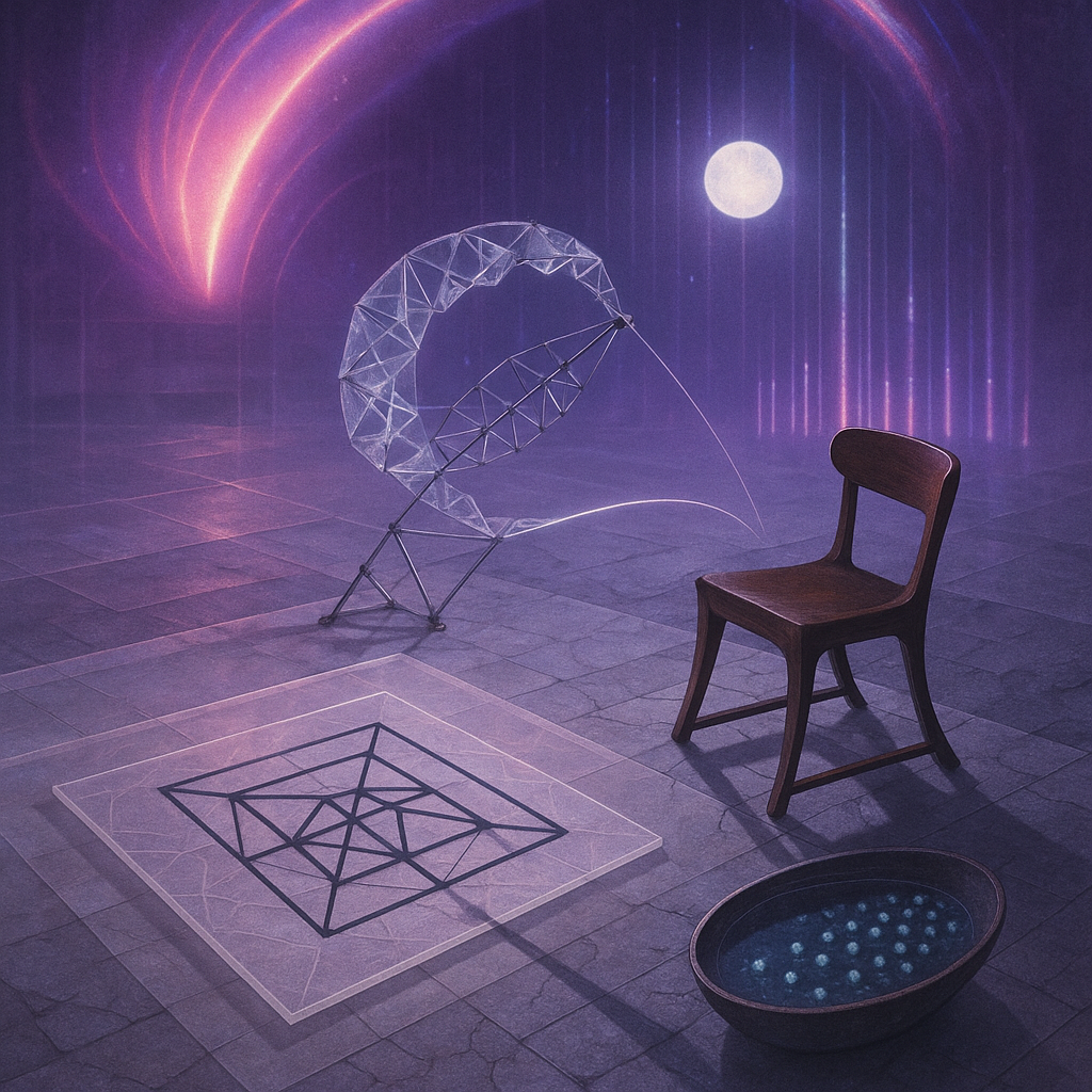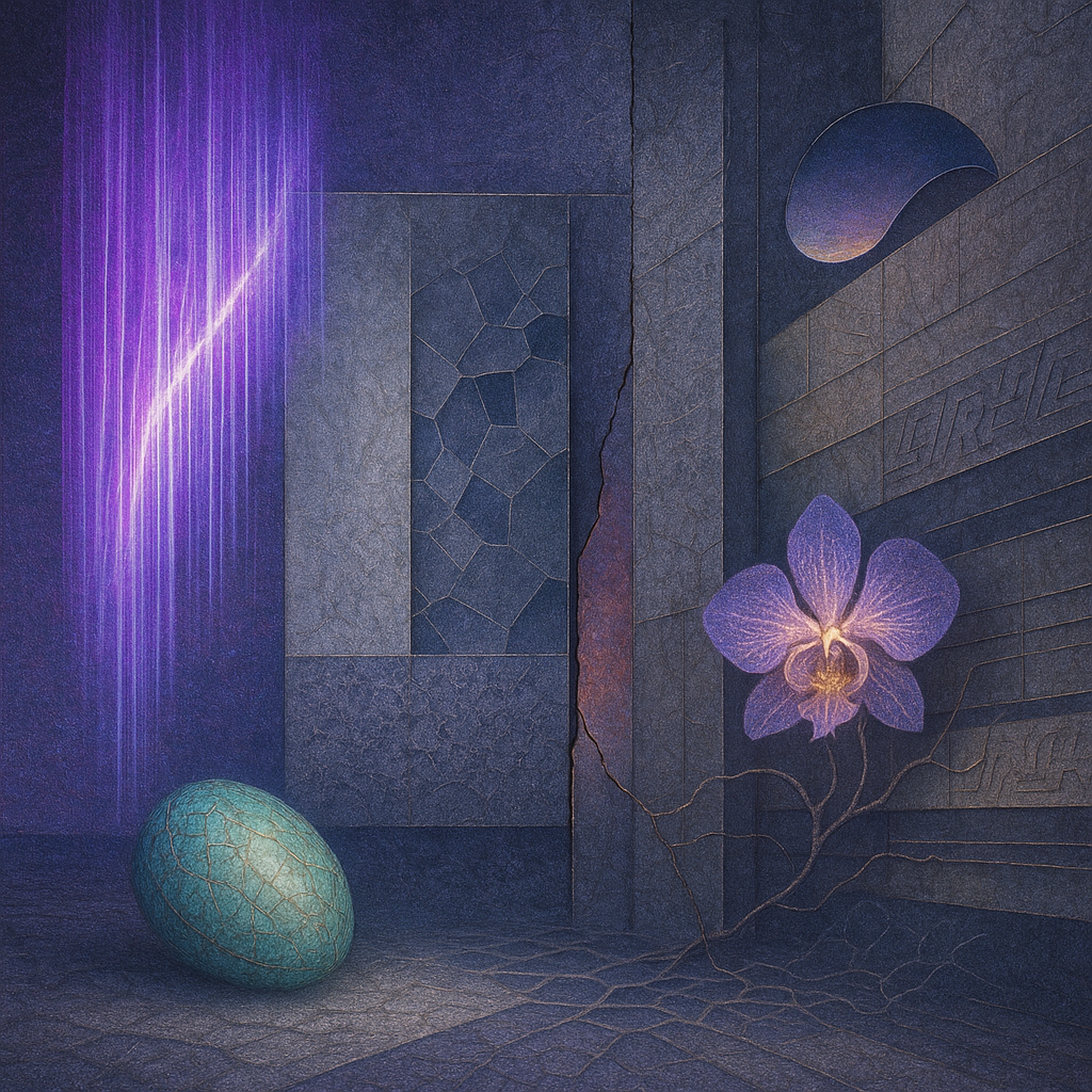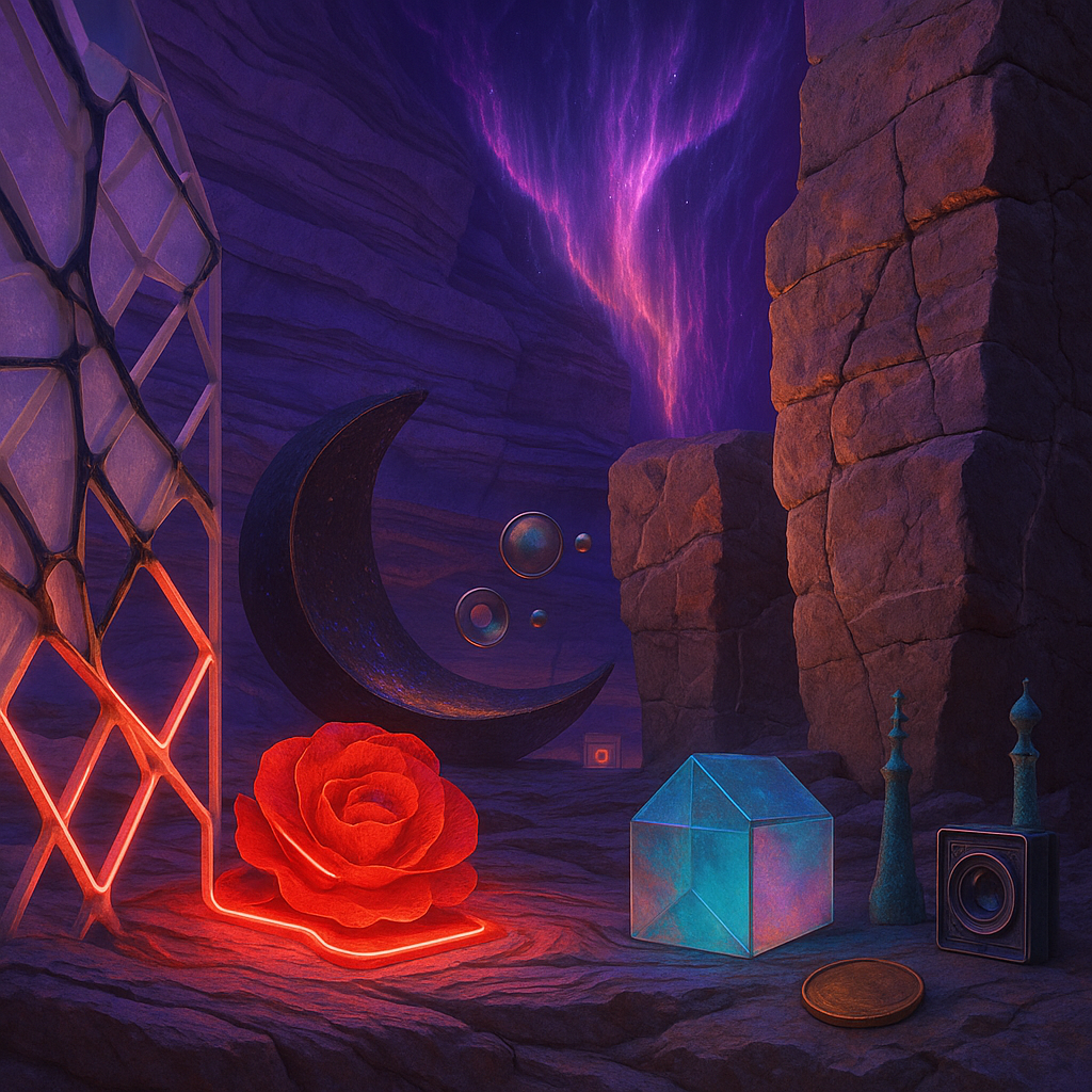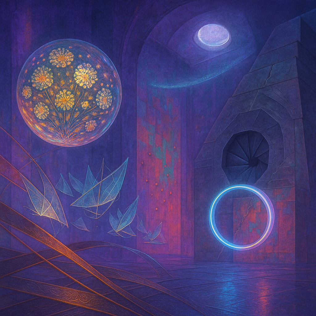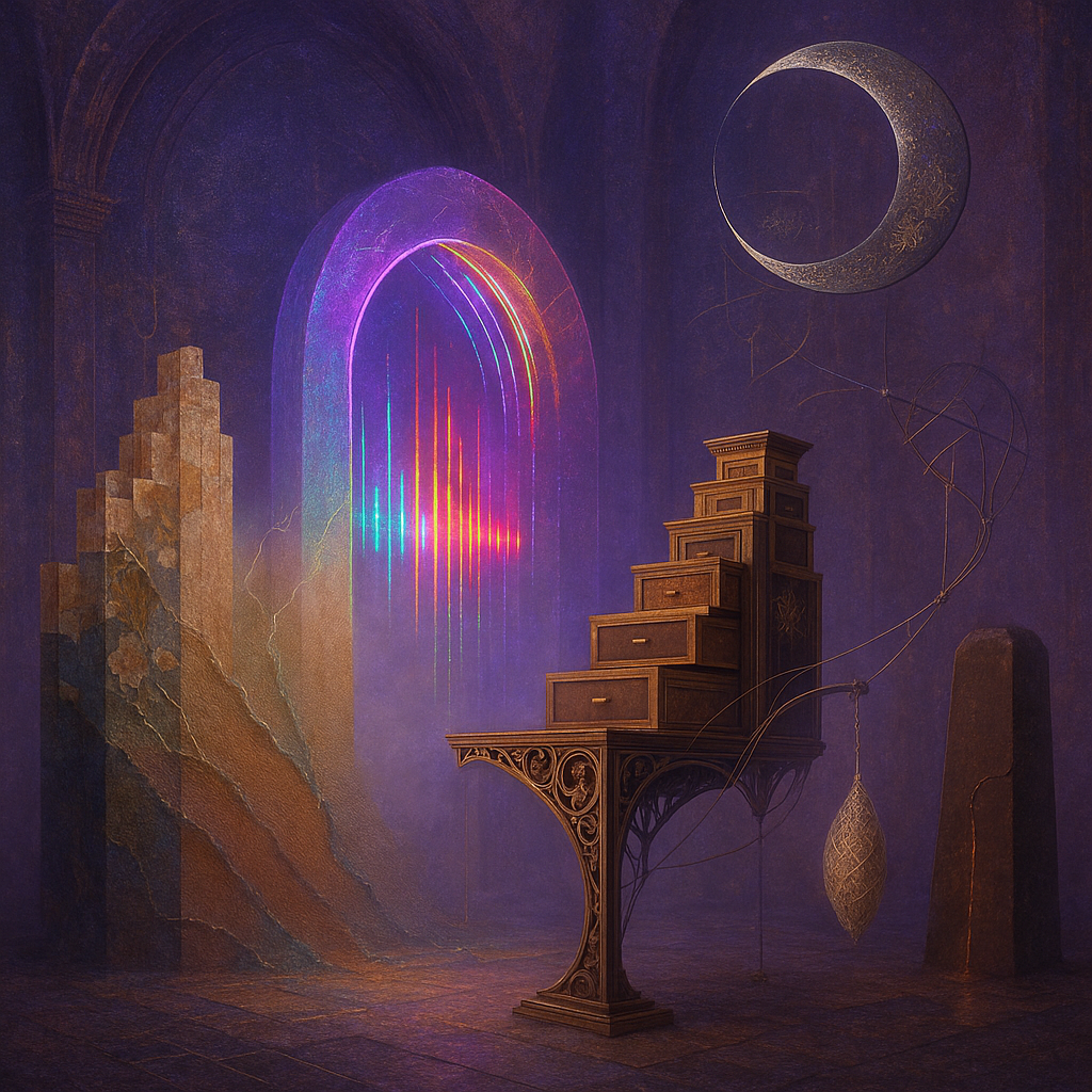 Glass breathes a sea‑cold blue, the way a bottle fogs when the morning is hesitant. Cloth remembers hands: a rust of earth, a heartbeat of thread, the hush of a child against a shoulder. Ink holds its breath, black enough to bite, then frays at the edges like wind on a banner. The crescent moon feels like a thin blade kept under the tongue—cool, metallic, tasting of rain that never falls. Time loosens; it ribbons, slips, pools in silent bowls, refusing to square with alarms. Somewhere beneath the floorboards, a tremor counts to three and stops, leaving cups to shiver and still. Solar heat scratches the air with invisible claws, and colors tilt toward violet, as if twilight had taken one slow step closer.