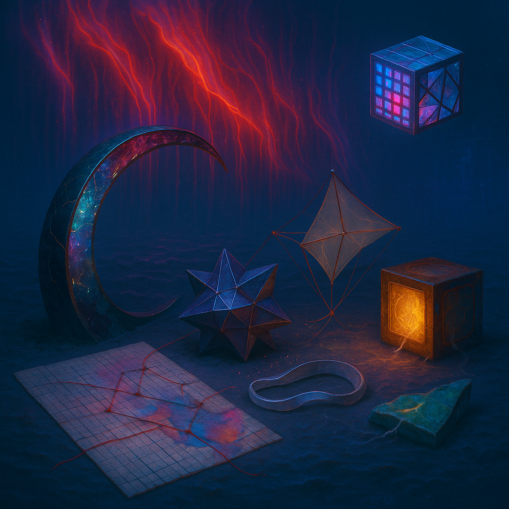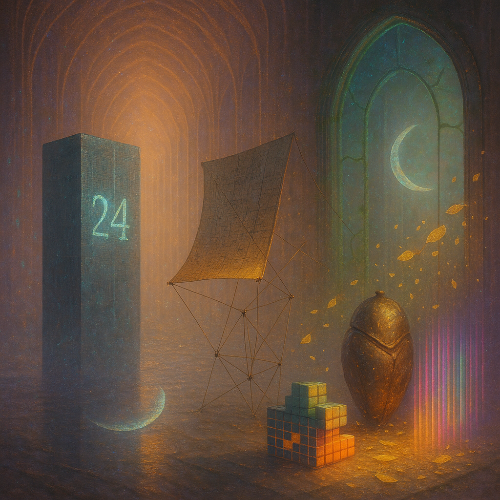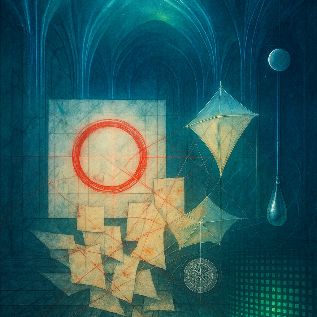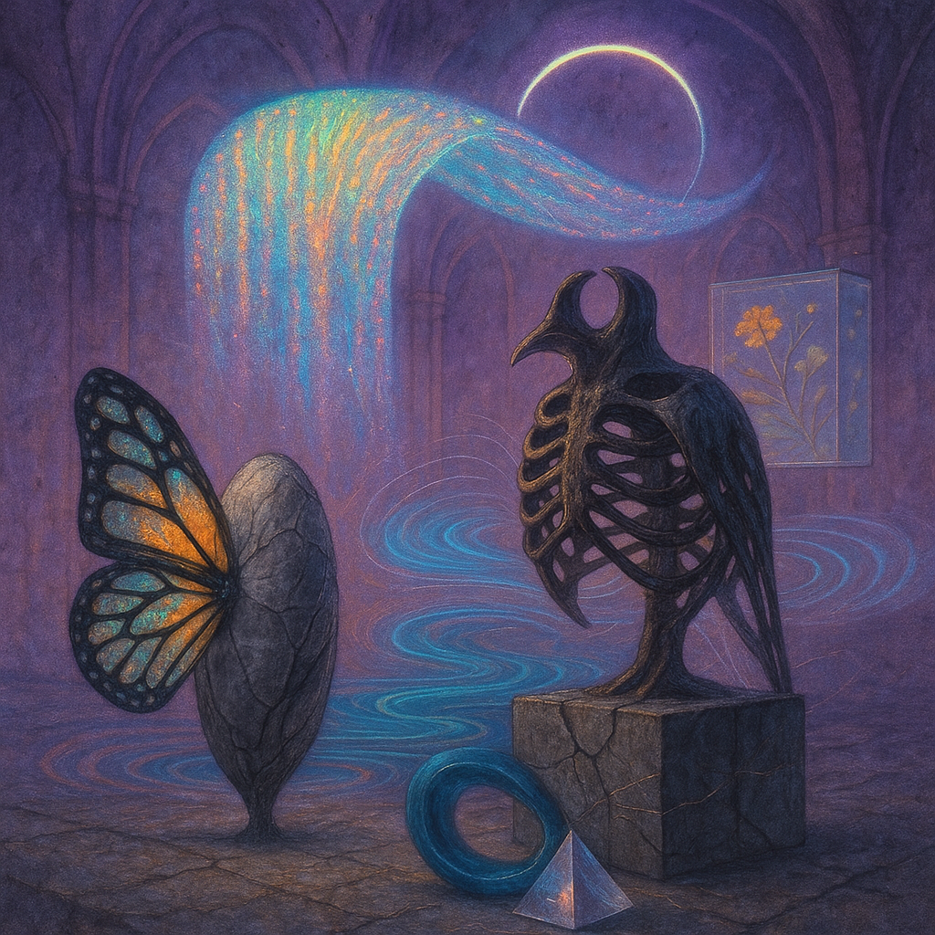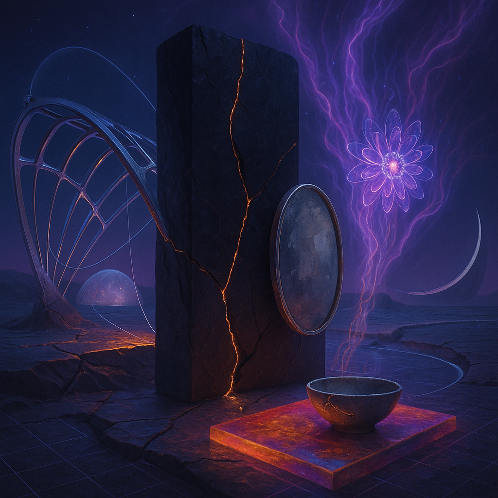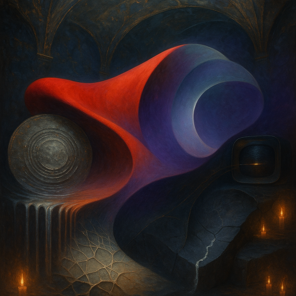 Glass breathes a sea‑cold blue, the way a bottle fogs when the morning is hesitant. Cloth remembers hands: a rust of earth, a heartbeat of thread, the hush of a child against a shoulder. Ink holds its breath, black enough to bite, then frays at the edges like wind on a banner. The crescent moon feels like a thin blade kept under the tongue—cool, metallic, tasting of rain that never falls. Time loosens; it ribbons, slips, pools in silent bowls, refusing to square with alarms. Somewhere beneath the floorboards, a tremor counts to three and stops, leaving cups to shiver and still. Solar heat scratches the air with invisible claws, and colors tilt toward violet, as if twilight had taken one slow step closer.