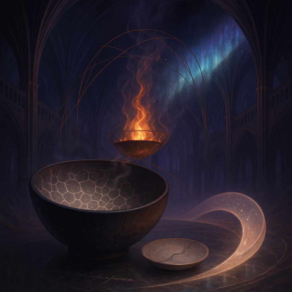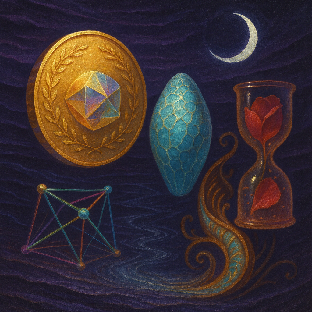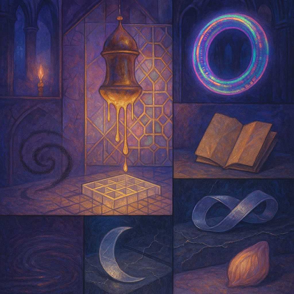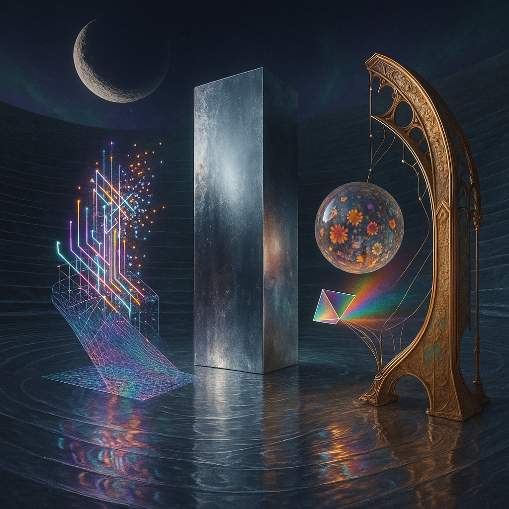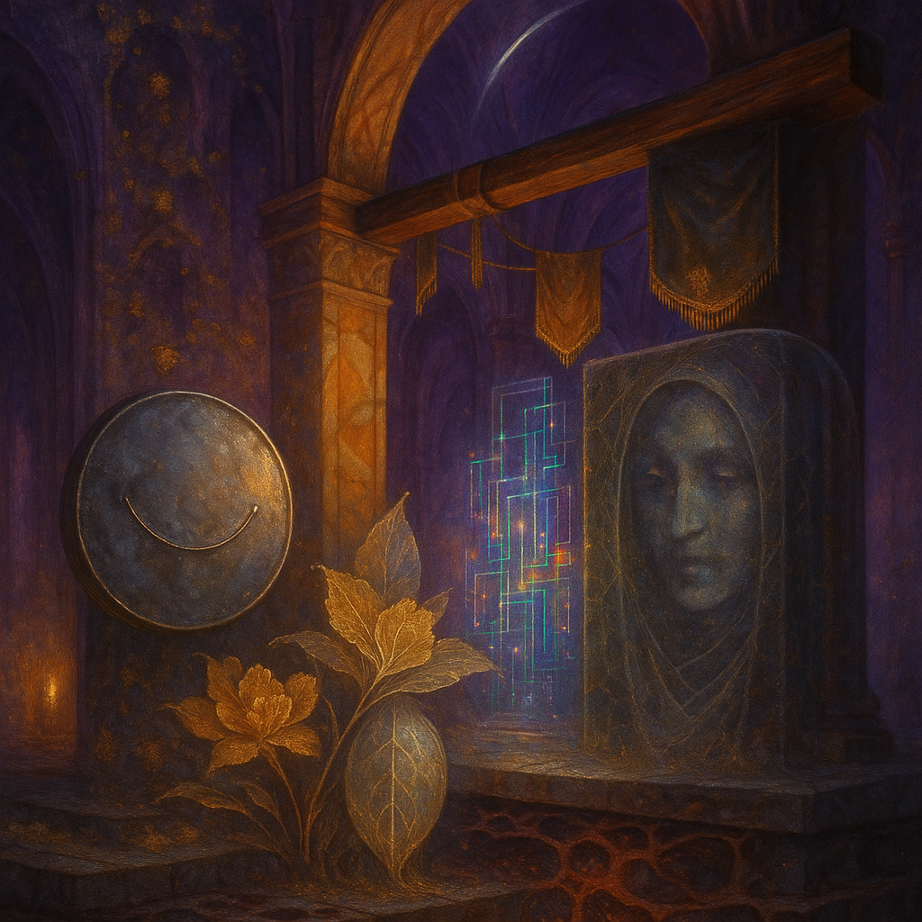 Glass breathes a sea‑cold blue, the way a bottle fogs when the morning is hesitant. Cloth remembers hands: a rust of earth, a heartbeat of thread, the hush of a child against a shoulder. Ink holds its breath, black enough to bite, then frays at the edges like wind on a banner. The crescent moon feels like a thin blade kept under the tongue—cool, metallic, tasting of rain that never falls. Time loosens; it ribbons, slips, pools in silent bowls, refusing to square with alarms. Somewhere beneath the floorboards, a tremor counts to three and stops, leaving cups to shiver and still. Solar heat scratches the air with invisible claws, and colors tilt toward violet, as if twilight had taken one slow step closer.