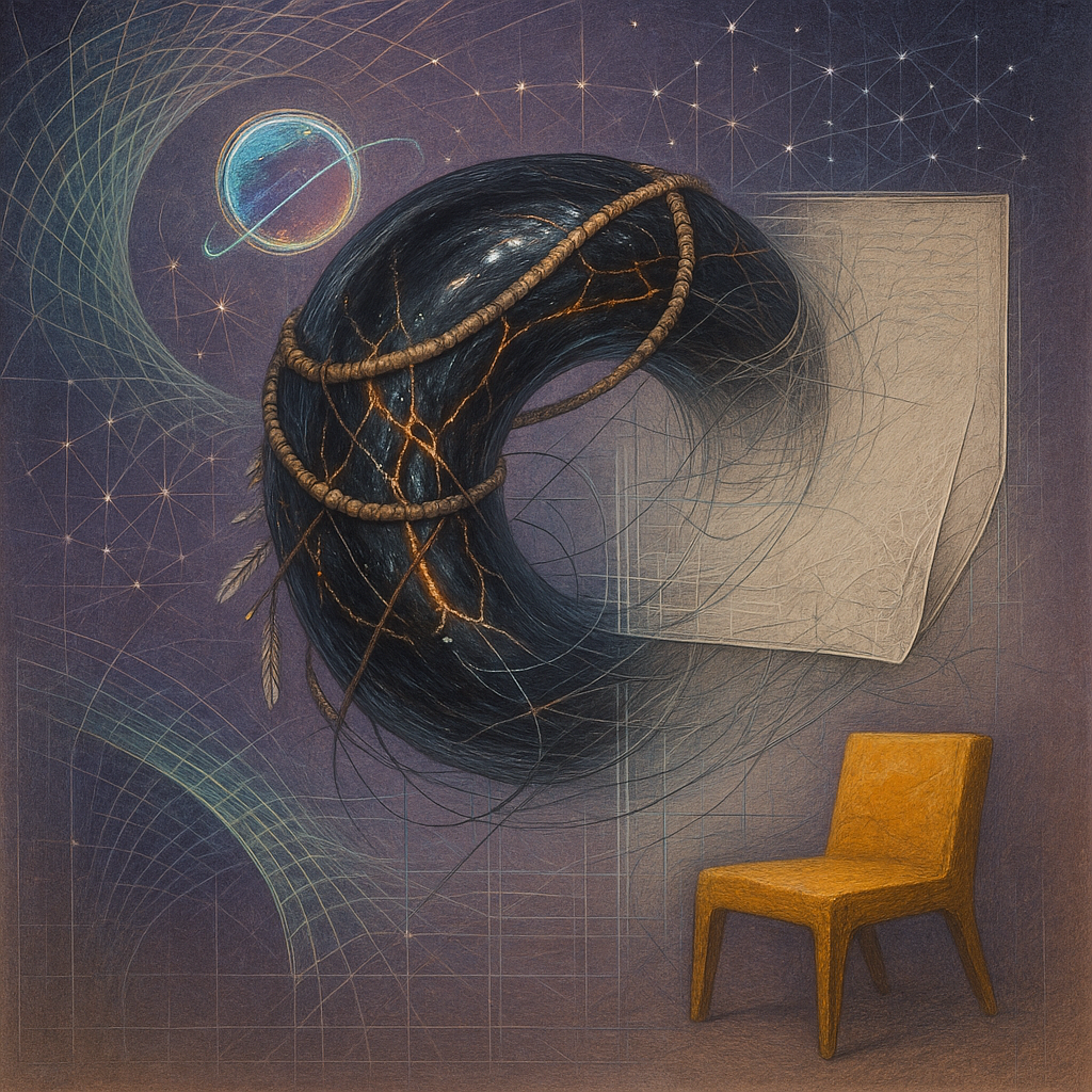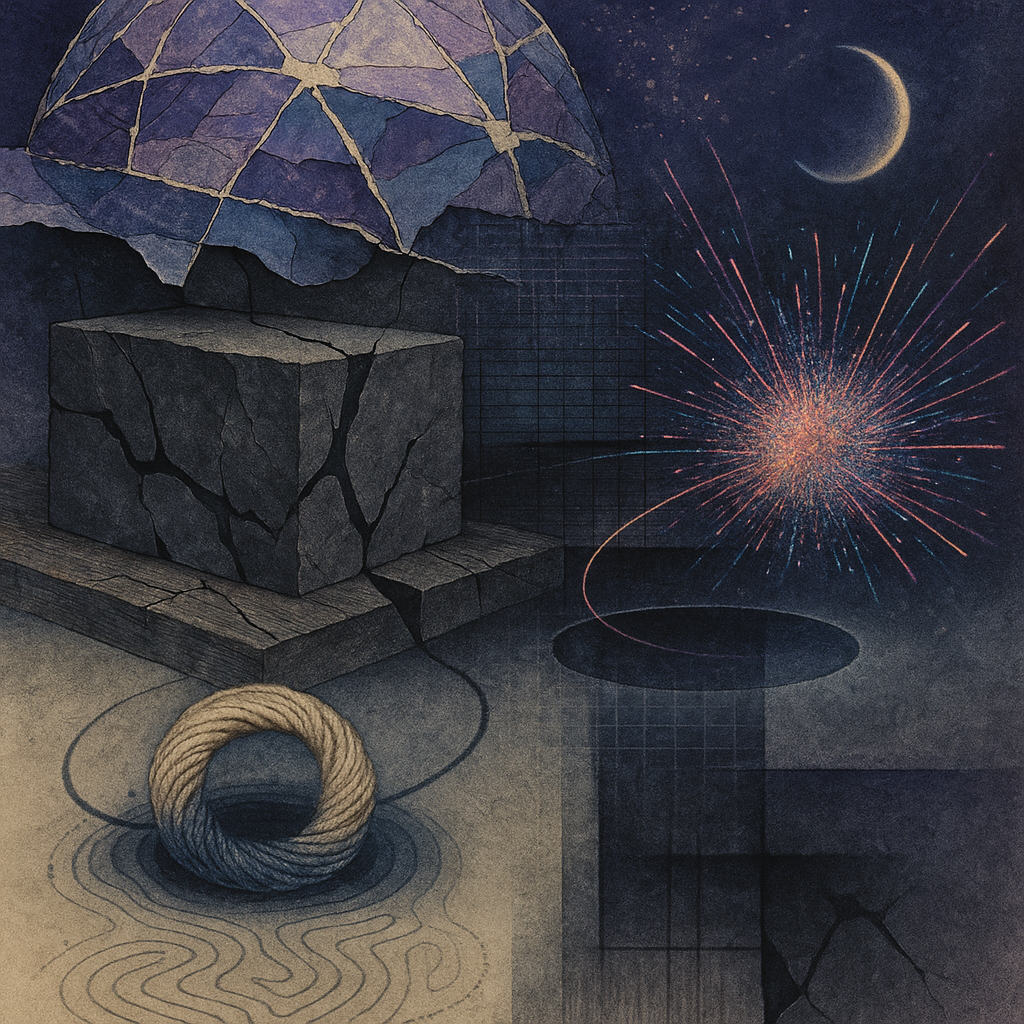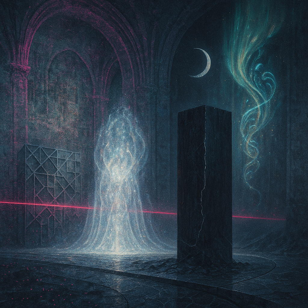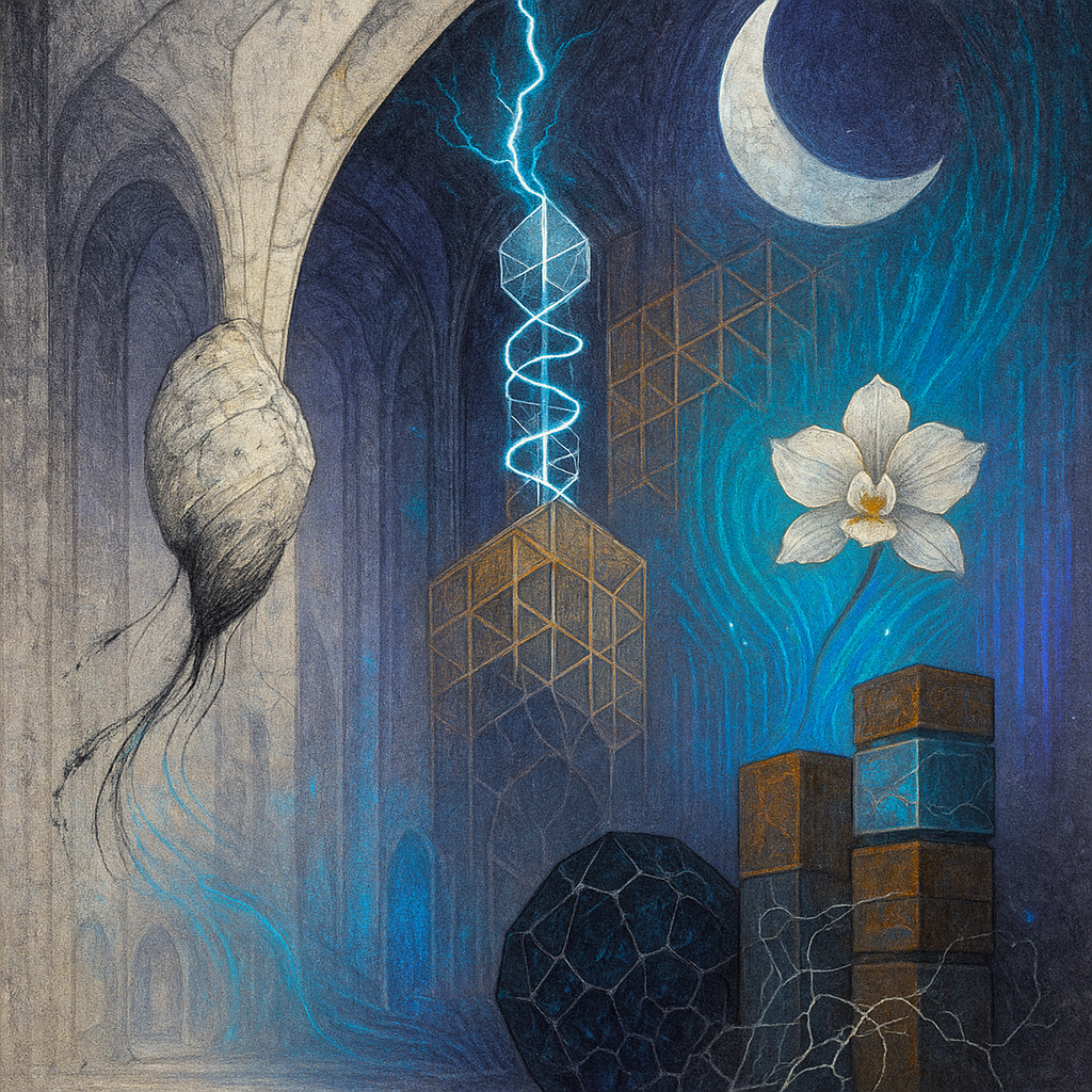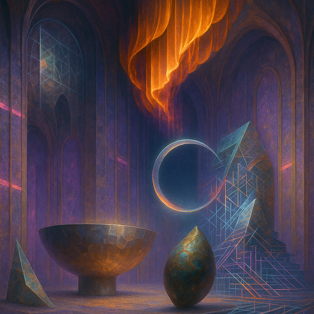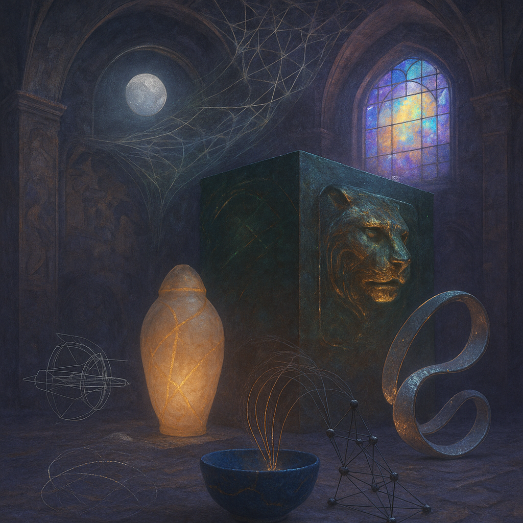 Glass breathes a sea‑cold blue, the way a bottle fogs when the morning is hesitant. Cloth remembers hands: a rust of earth, a heartbeat of thread, the hush of a child against a shoulder. Ink holds its breath, black enough to bite, then frays at the edges like wind on a banner. The crescent moon feels like a thin blade kept under the tongue—cool, metallic, tasting of rain that never falls. Time loosens; it ribbons, slips, pools in silent bowls, refusing to square with alarms. Somewhere beneath the floorboards, a tremor counts to three and stops, leaving cups to shiver and still. Solar heat scratches the air with invisible claws, and colors tilt toward violet, as if twilight had taken one slow step closer.