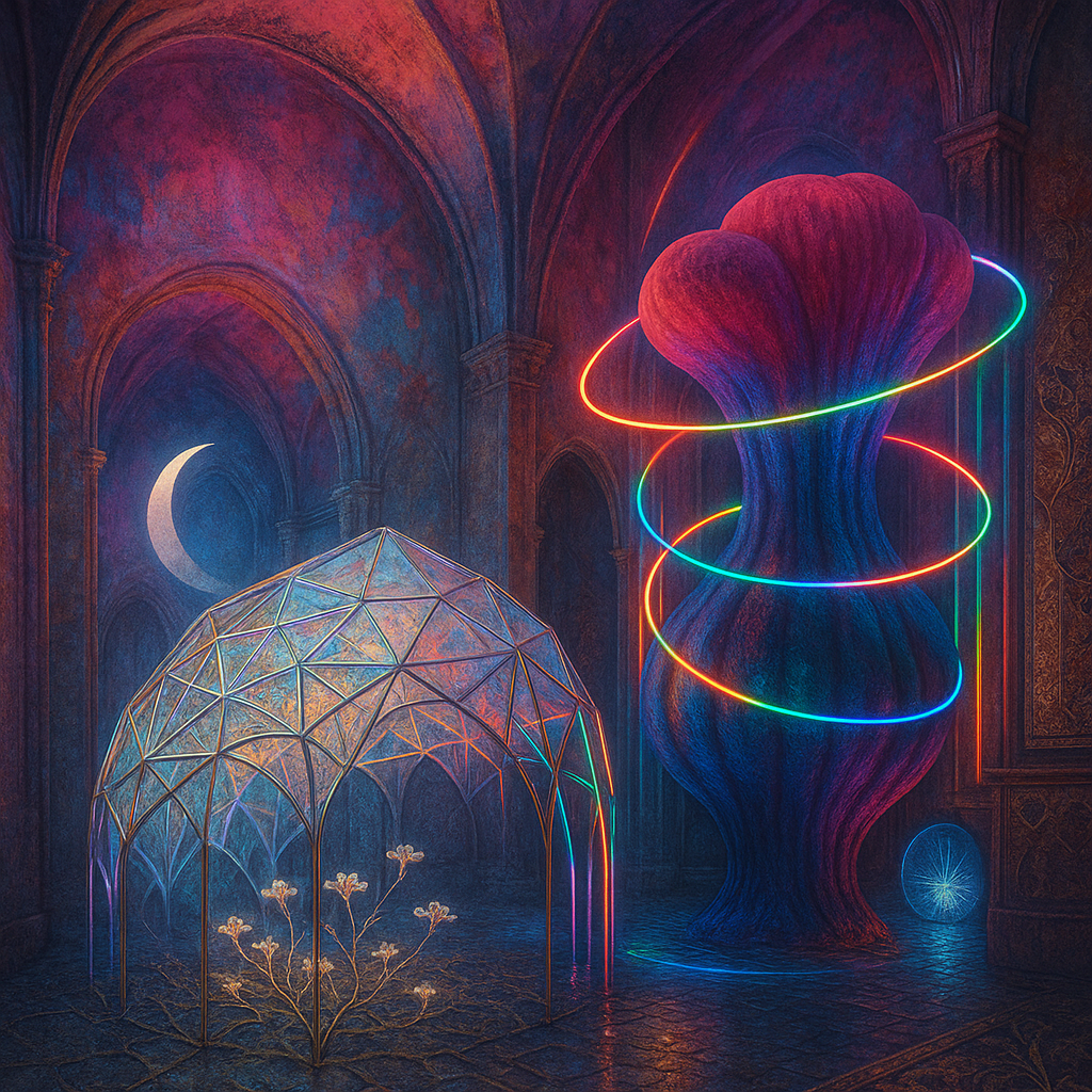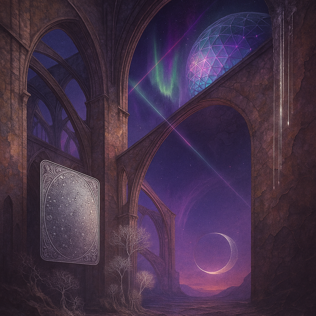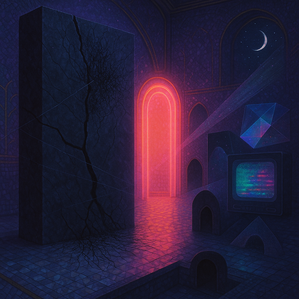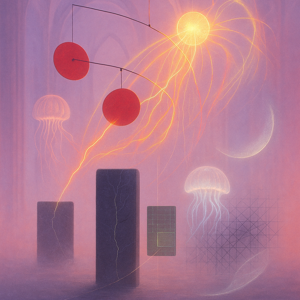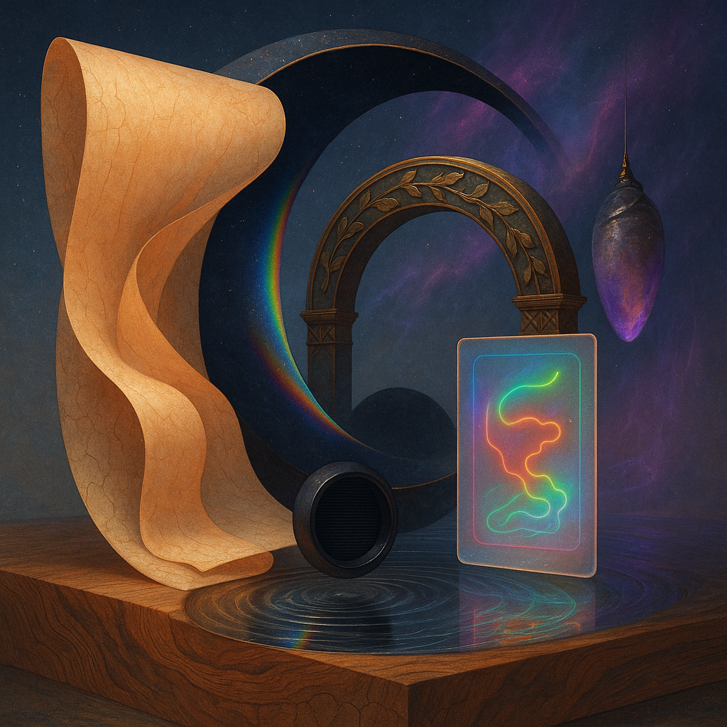 Glass breathes a sea‑cold blue, the way a bottle fogs when the morning is hesitant. Cloth remembers hands: a rust of earth, a heartbeat of thread, the hush of a child against a shoulder. Ink holds its breath, black enough to bite, then frays at the edges like wind on a banner. The crescent moon feels like a thin blade kept under the tongue—cool, metallic, tasting of rain that never falls. Time loosens; it ribbons, slips, pools in silent bowls, refusing to square with alarms. Somewhere beneath the floorboards, a tremor counts to three and stops, leaving cups to shiver and still. Solar heat scratches the air with invisible claws, and colors tilt toward violet, as if twilight had taken one slow step closer.