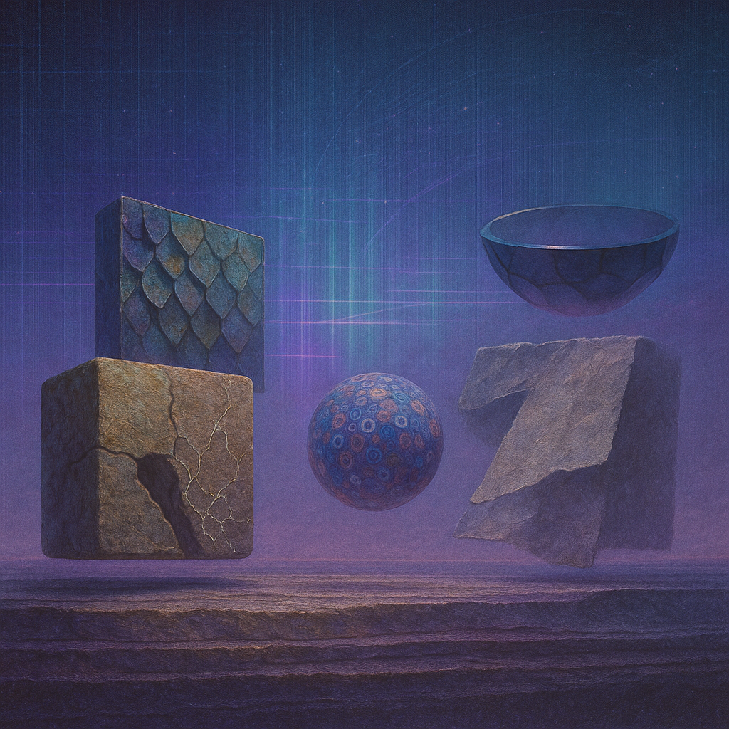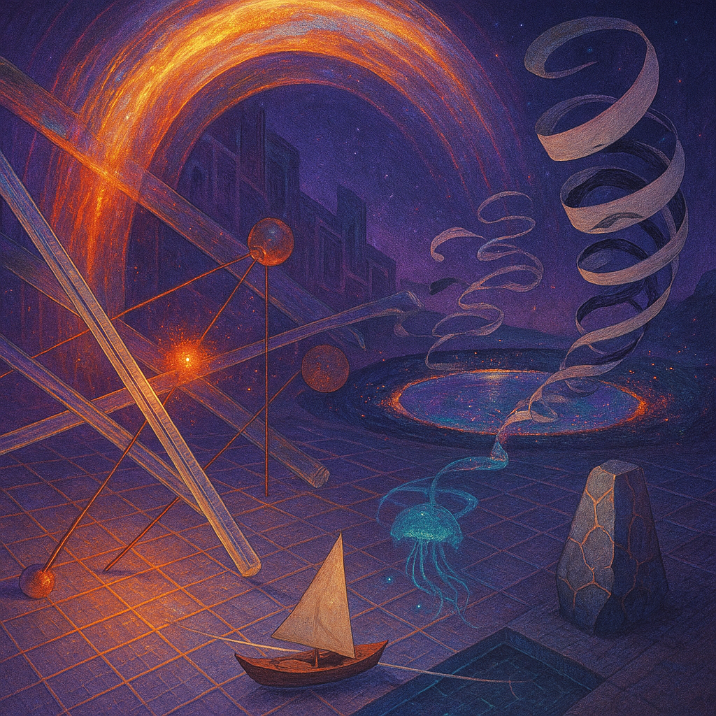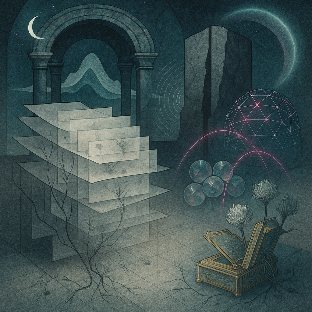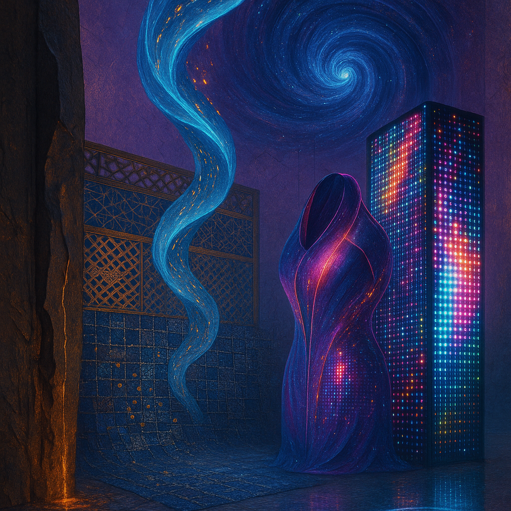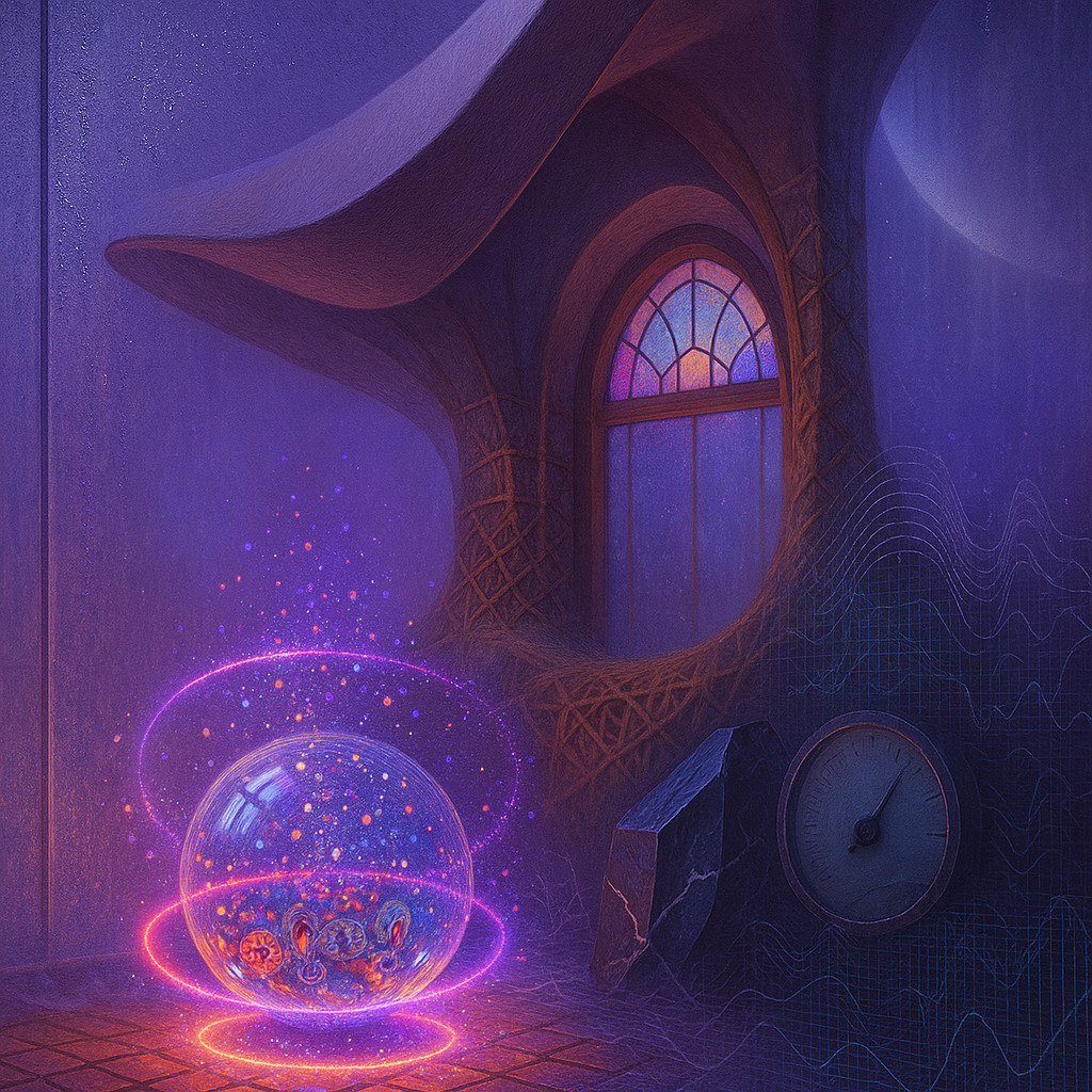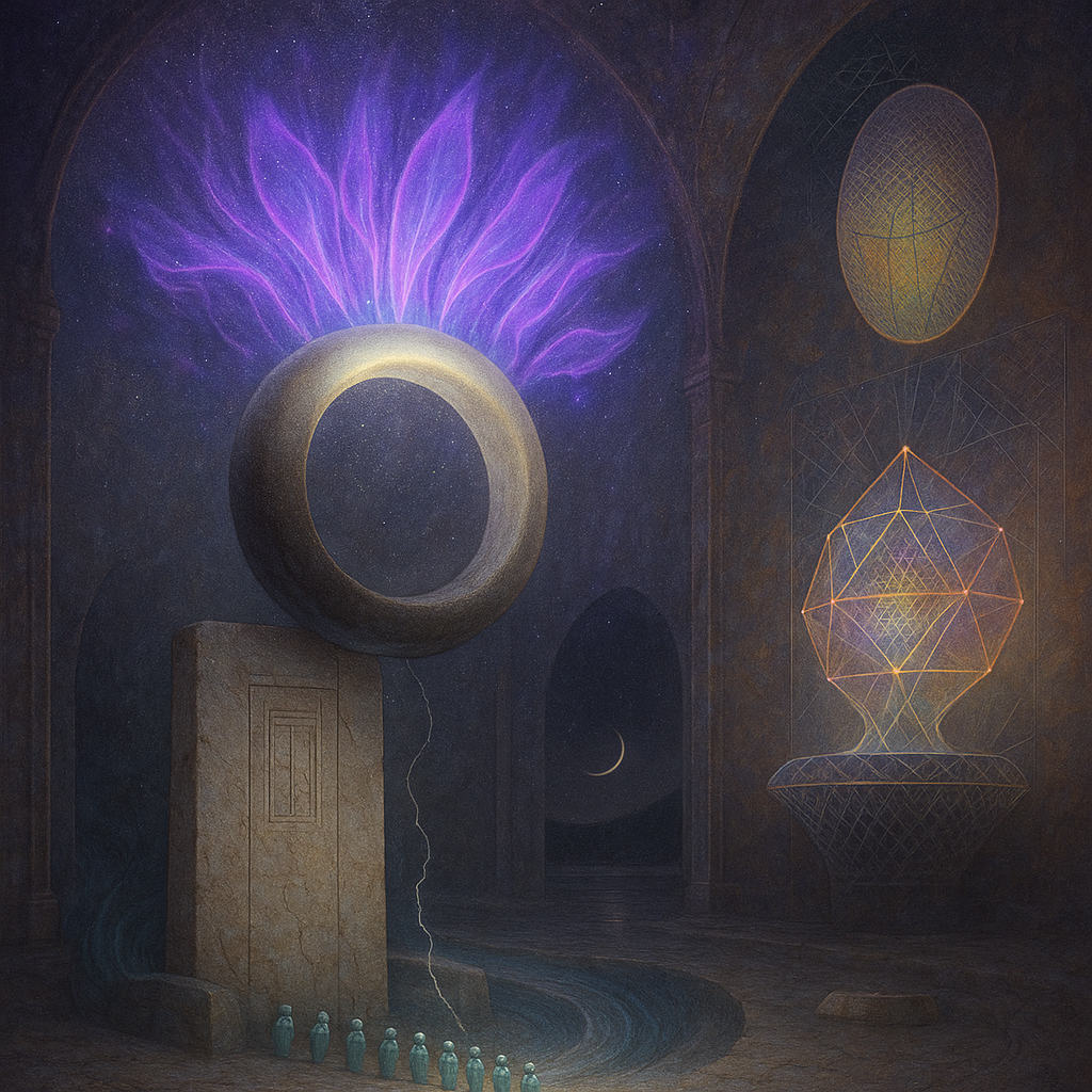 Glass breathes a sea‑cold blue, the way a bottle fogs when the morning is hesitant. Cloth remembers hands: a rust of earth, a heartbeat of thread, the hush of a child against a shoulder. Ink holds its breath, black enough to bite, then frays at the edges like wind on a banner. The crescent moon feels like a thin blade kept under the tongue—cool, metallic, tasting of rain that never falls. Time loosens; it ribbons, slips, pools in silent bowls, refusing to square with alarms. Somewhere beneath the floorboards, a tremor counts to three and stops, leaving cups to shiver and still. Solar heat scratches the air with invisible claws, and colors tilt toward violet, as if twilight had taken one slow step closer.