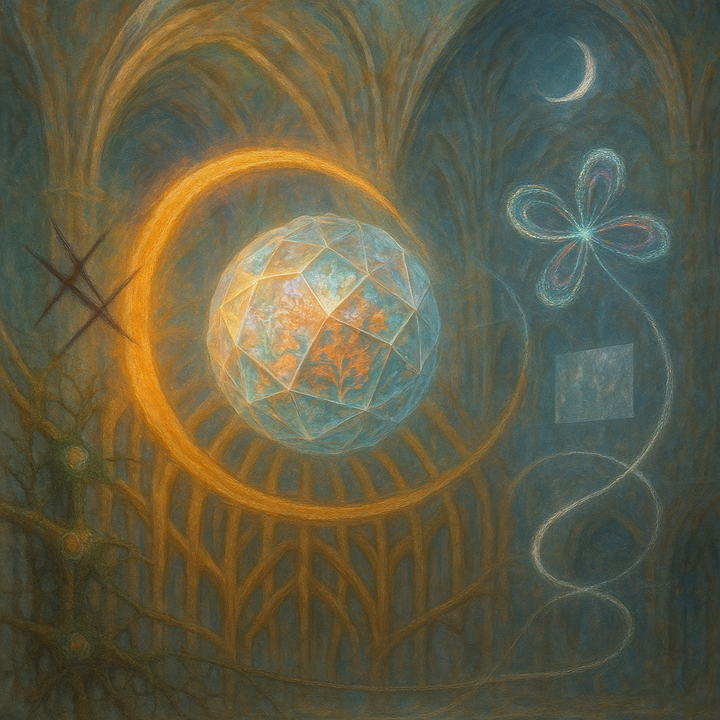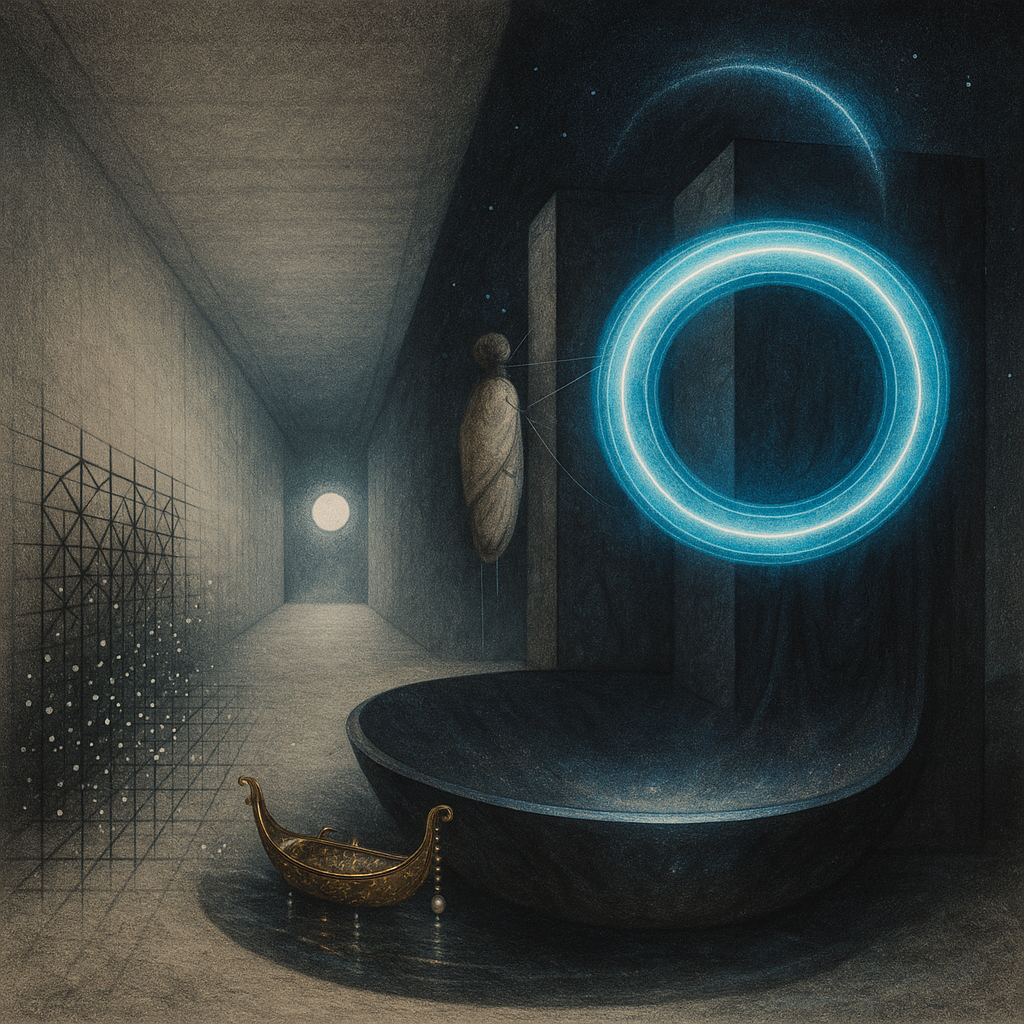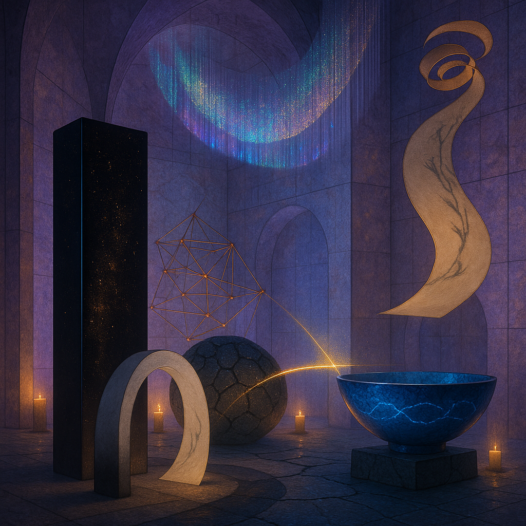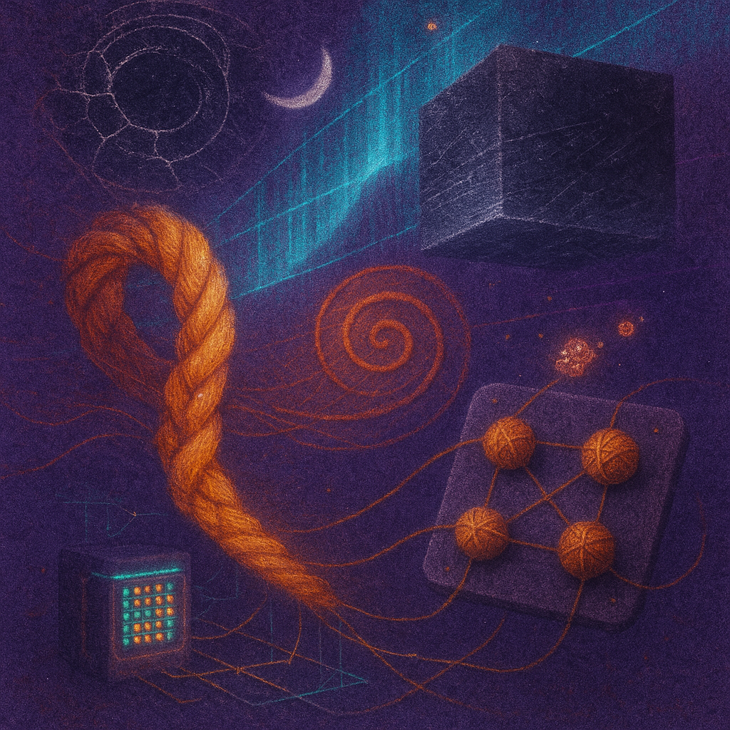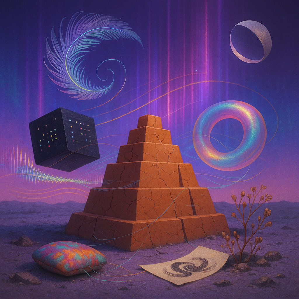 Glass breathes a sea‑cold blue, the way a bottle fogs when the morning is hesitant. Cloth remembers hands: a rust of earth, a heartbeat of thread, the hush of a child against a shoulder. Ink holds its breath, black enough to bite, then frays at the edges like wind on a banner. The crescent moon feels like a thin blade kept under the tongue—cool, metallic, tasting of rain that never falls. Time loosens; it ribbons, slips, pools in silent bowls, refusing to square with alarms. Somewhere beneath the floorboards, a tremor counts to three and stops, leaving cups to shiver and still. Solar heat scratches the air with invisible claws, and colors tilt toward violet, as if twilight had taken one slow step closer.