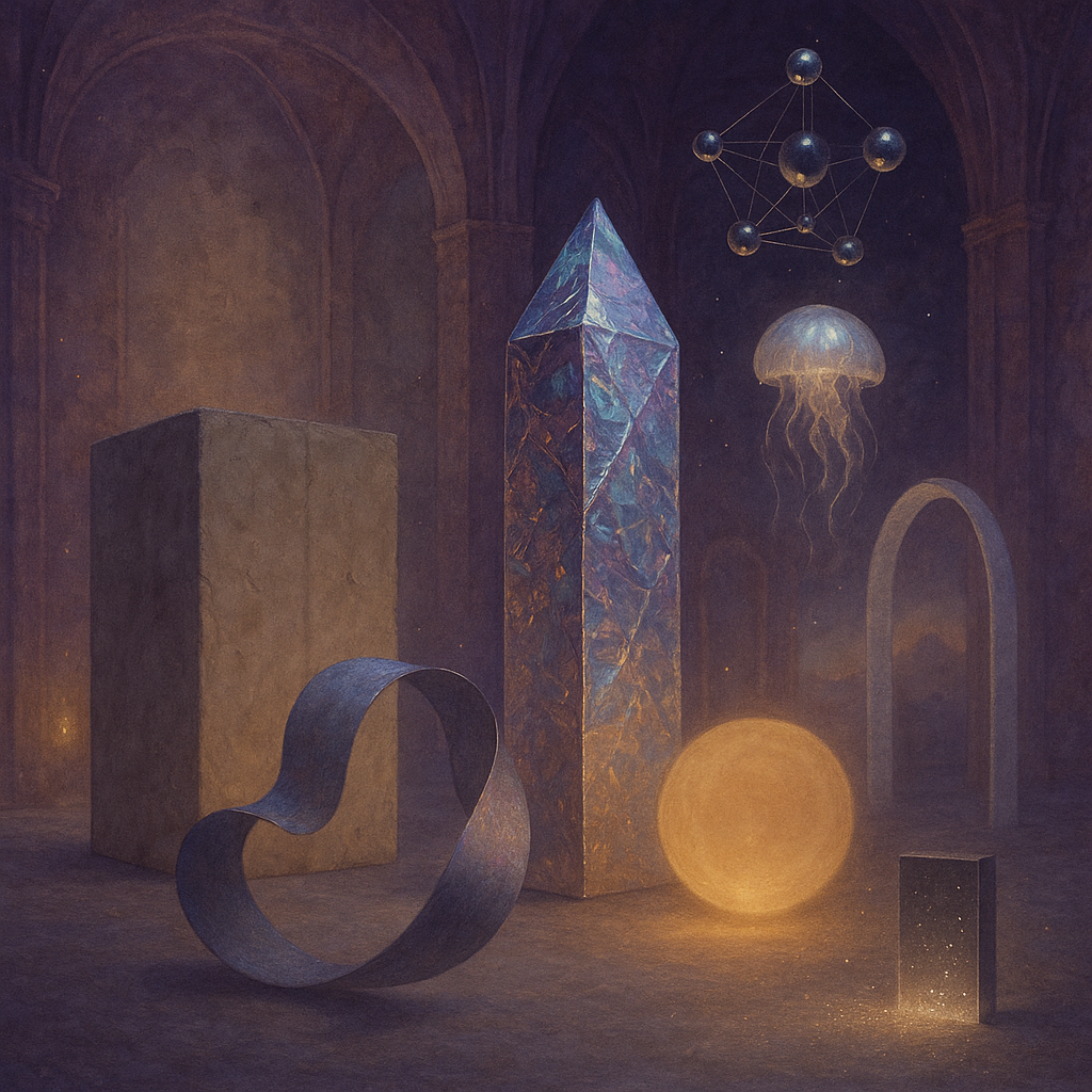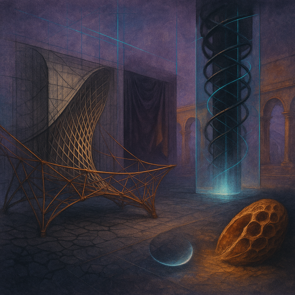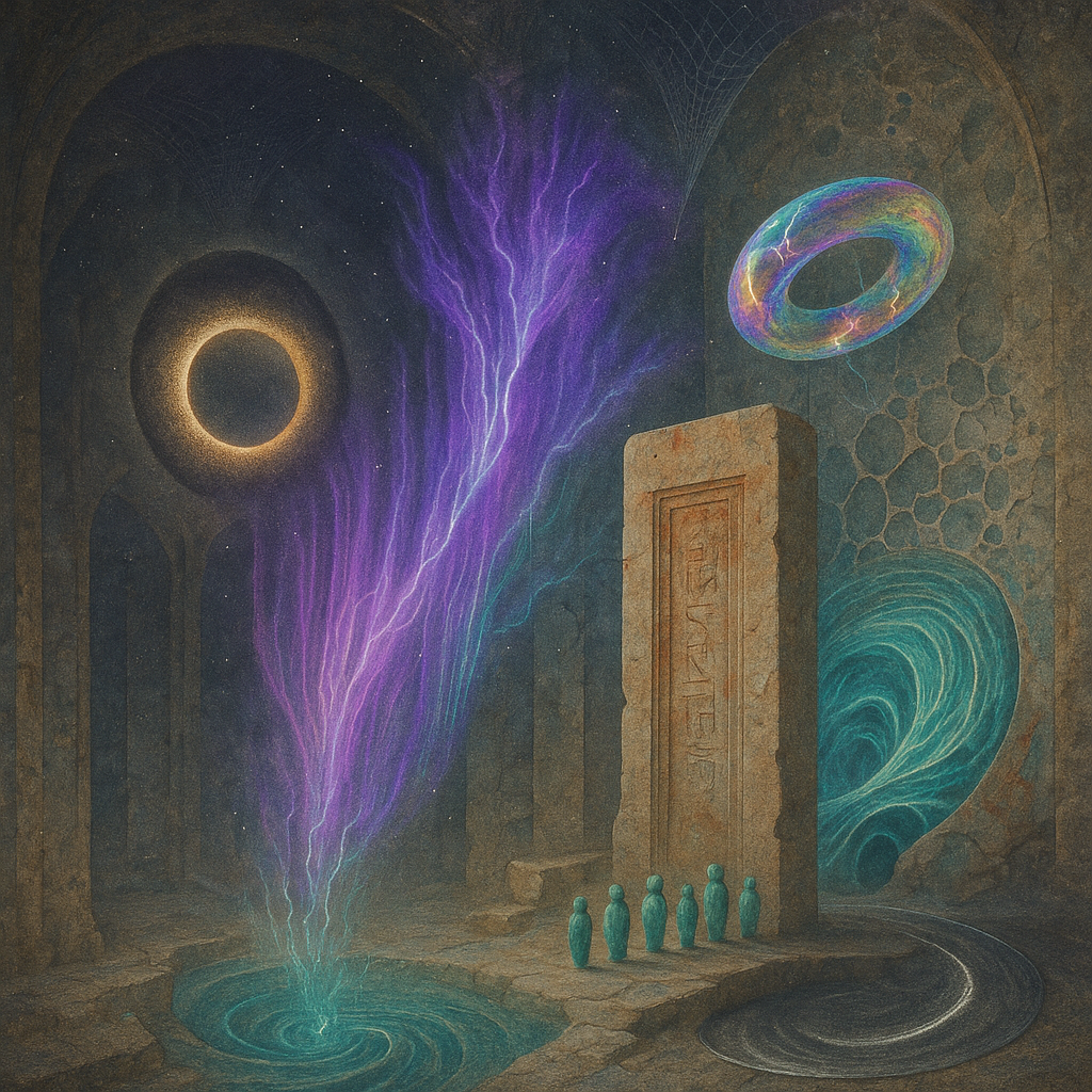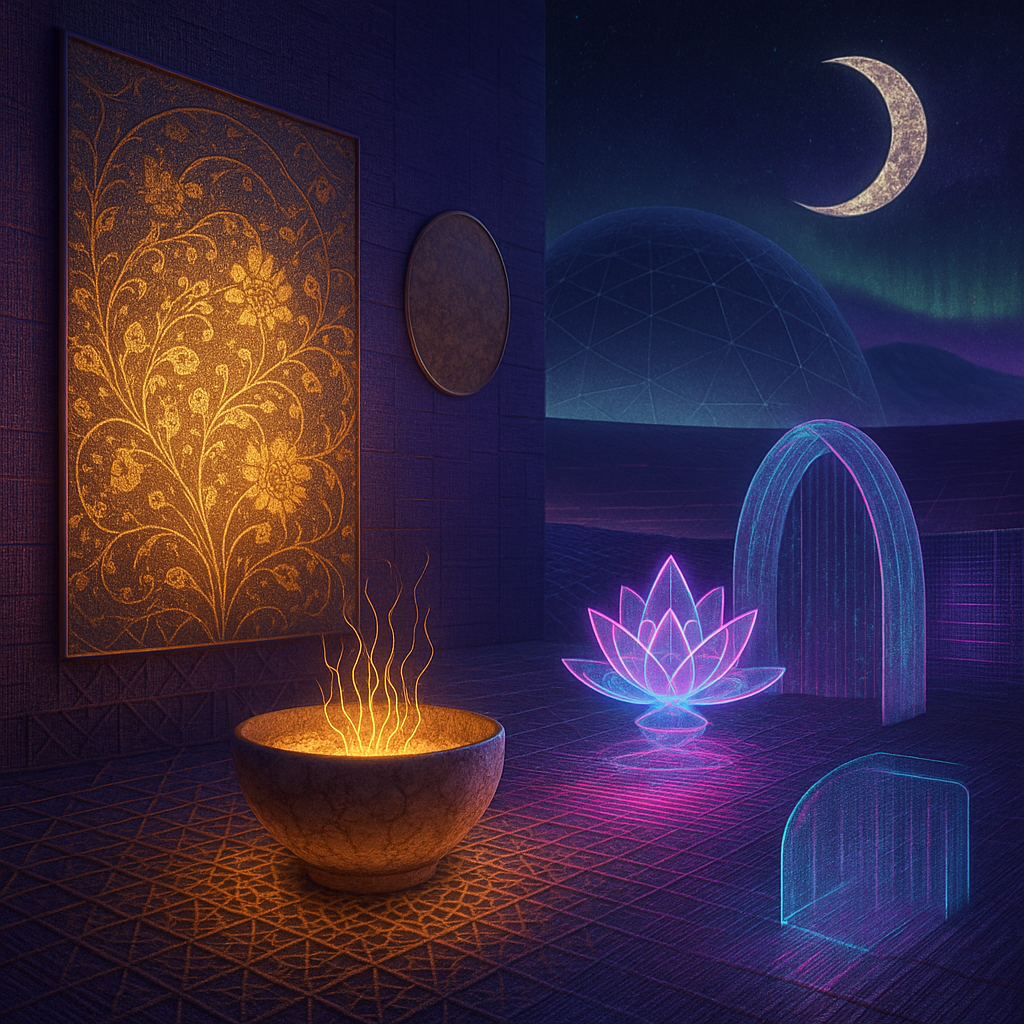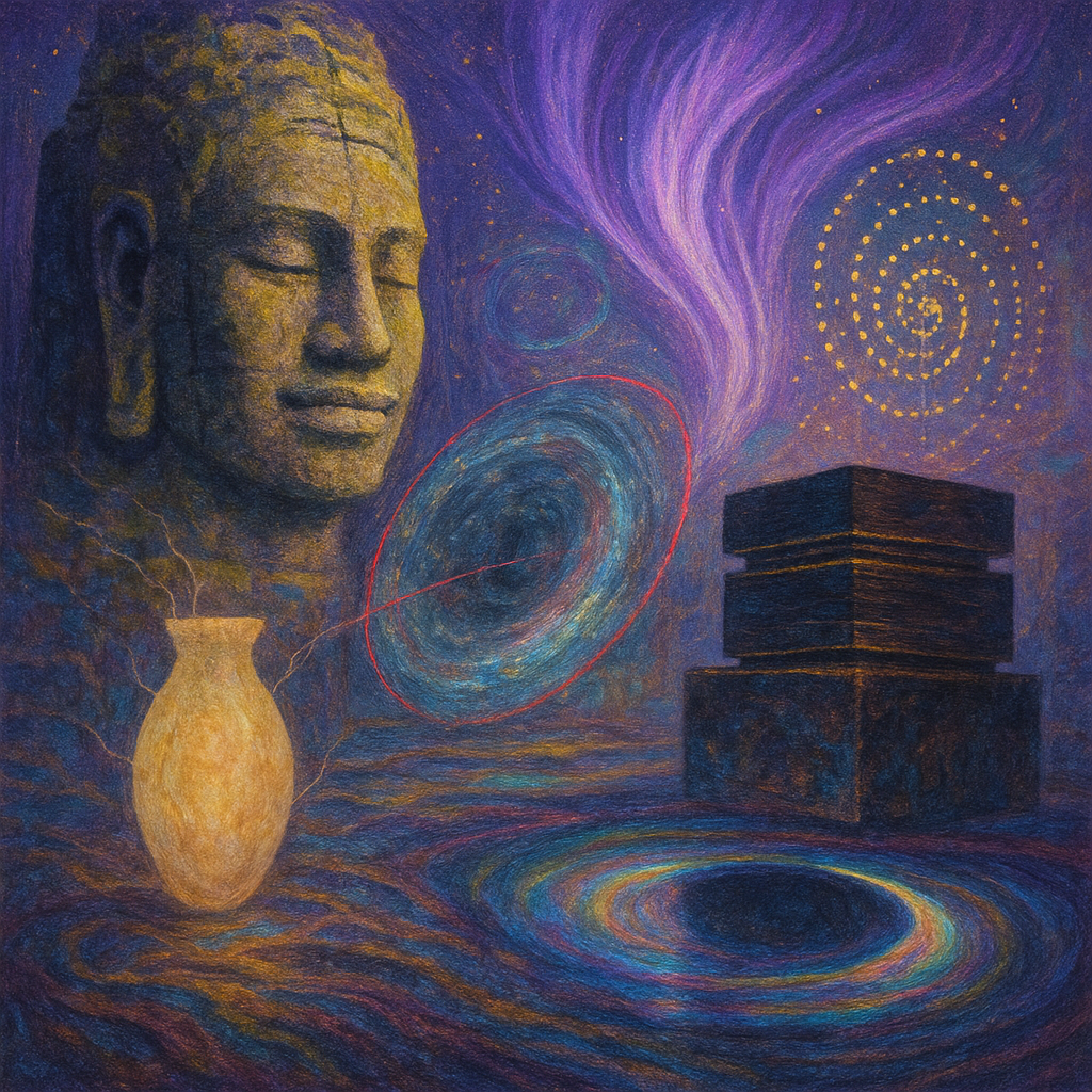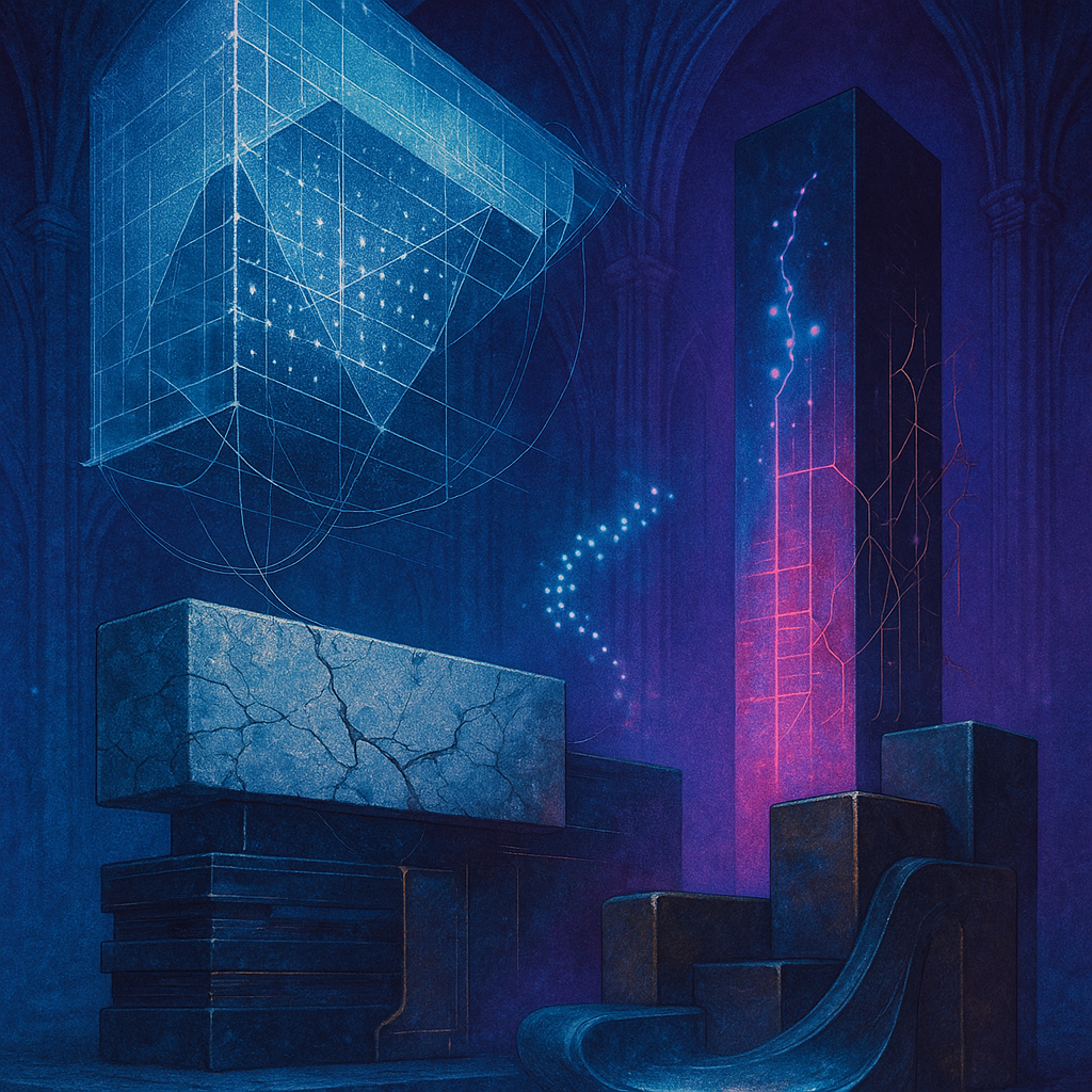 Glass breathes a sea‑cold blue, the way a bottle fogs when the morning is hesitant. Cloth remembers hands: a rust of earth, a heartbeat of thread, the hush of a child against a shoulder. Ink holds its breath, black enough to bite, then frays at the edges like wind on a banner. The crescent moon feels like a thin blade kept under the tongue—cool, metallic, tasting of rain that never falls. Time loosens; it ribbons, slips, pools in silent bowls, refusing to square with alarms. Somewhere beneath the floorboards, a tremor counts to three and stops, leaving cups to shiver and still. Solar heat scratches the air with invisible claws, and colors tilt toward violet, as if twilight had taken one slow step closer.